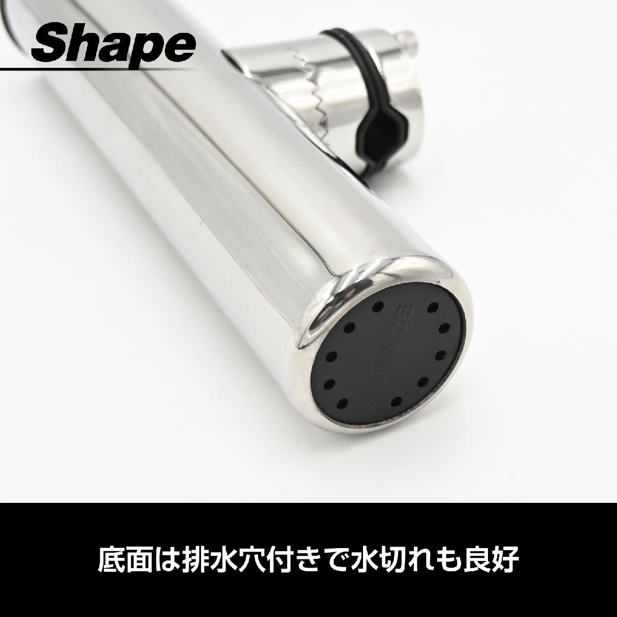 鏡面仕上げの高級ステンレスは耐久性・耐食性に優れ、内側ライナーが竿を傷から守ります。底面は排水穴付きで水切れも良好。