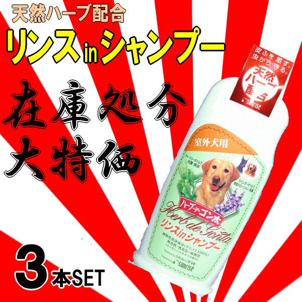 | 商品名 : サンライズ ハーブ・デ・ゴン太 (リンスinシャンプー) 愛犬の皮膚と被毛をいたわる自然派シャンプー。結構使いやすいですよ! 在庫処分品で売り切り品の為、今ならお得な3本セット! 豊かでキメ細やかな泡立ちが、ガンコな汚れをしっかり落として、すすぎも簡単。 リンス成分と天然ハーブの力でさっぱりサラサラに仕上げます。天然ハーブの香りでアロマテラピー効果も… 植物性リンス成分[カチオン化セルロース]は被毛をコートし、もつれ毛、毛玉などができるのを予防。 天然ハーブオイル配合[ティーツリー&ラベンダー] 天然ハーブは愛犬の嗅覚に負担をかけない自然な香りで、気になるニオイもおさえます。 ■ティーツリー オーストラリアの先住民族 “アボリジニ”によって、古くから民間療法に用いられてきた木です。その葉から抽出される精油は優れた浄化力をもち、除菌・抗菌作用があるとされ、除虫効果でも知られています。 ・アロマテラピー効果 : リフレッシュ ■ラベンダー ヨーロッパで古くから民間療法に用いられてきた植物で、その除菌・抗菌作用からローマ人は浴槽に入れて沐浴したといわれます。その精油には除虫・消臭効果があるとされ、ヘアトニックや香水の原料としても有名です。 ・アロマテラピー効果 : リラックス ・植物性洗浄成分(ヤシノミ100%) ・無香料・無着色・弱酸性(エッセンシャルオイル配合) ・内容量:350ml × 3本セット ■ご使用方法(洗い方) 毛玉ができるのを予防するために、シャンプー前によくブラッシングをして毛のもつれをほぐして下さい。ぬるま湯で湿らせた後、背中の方から本品適量をふりかけ、マッサージする様に泡立て、毛並みの方向に洗います。シャンプーの後はお湯で十分にすすいで下さい。洗い流してもリンス効果がなくなることはありませんので、すすぎ残しのないように注意して下さい。 他のペット用シャンプー・リンスも出品しておりますのでご覧下さい。 |