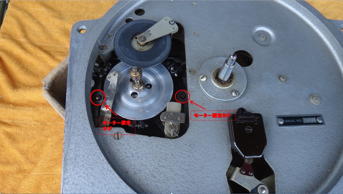● 到着後ターンテ-ブルをスピンドルに入れる前に必ず上部の赤色の2個のネジを緩めてモータ-を