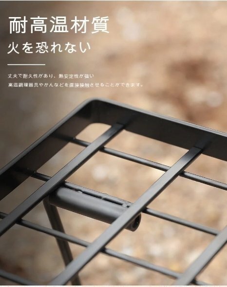 メッシュ部分は熱いスキレットやケトルなどを直接置いてもびくともしないスチール(鉄)素材(耐熱温度400℃)。