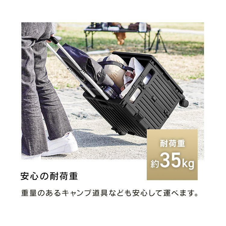 折りたたみキャリーカートです。 サッと広げて使えるこのカートなら、大きなキャスターが付いているので移動がラクラクです♪ 今までは体力が必要だった荷物の運搬をスムーズに! ★いろいろ使えるキャリーカート★ ・アウトドア時の荷物の持ち運びに ・スーパーなど、お買い物時の荷物の持ち運びに ・スポーツ用品の収納や持ち運びに ・ガーデニング用具や工具などの収納や持ち運びに 【商品仕様】 カラー:ブラック サイズ: ・使用時(約):幅42×奥行37×高さ37cm ・収納時(約):幅42×奥行7.5×高さ50cm ・内寸(約):幅39×奥行36×高さ37cm 材 質:ポリプロピレン樹脂 重量:(約)3.5kg 耐加重:(約)35kg フタ耐荷重:(約)90kg |