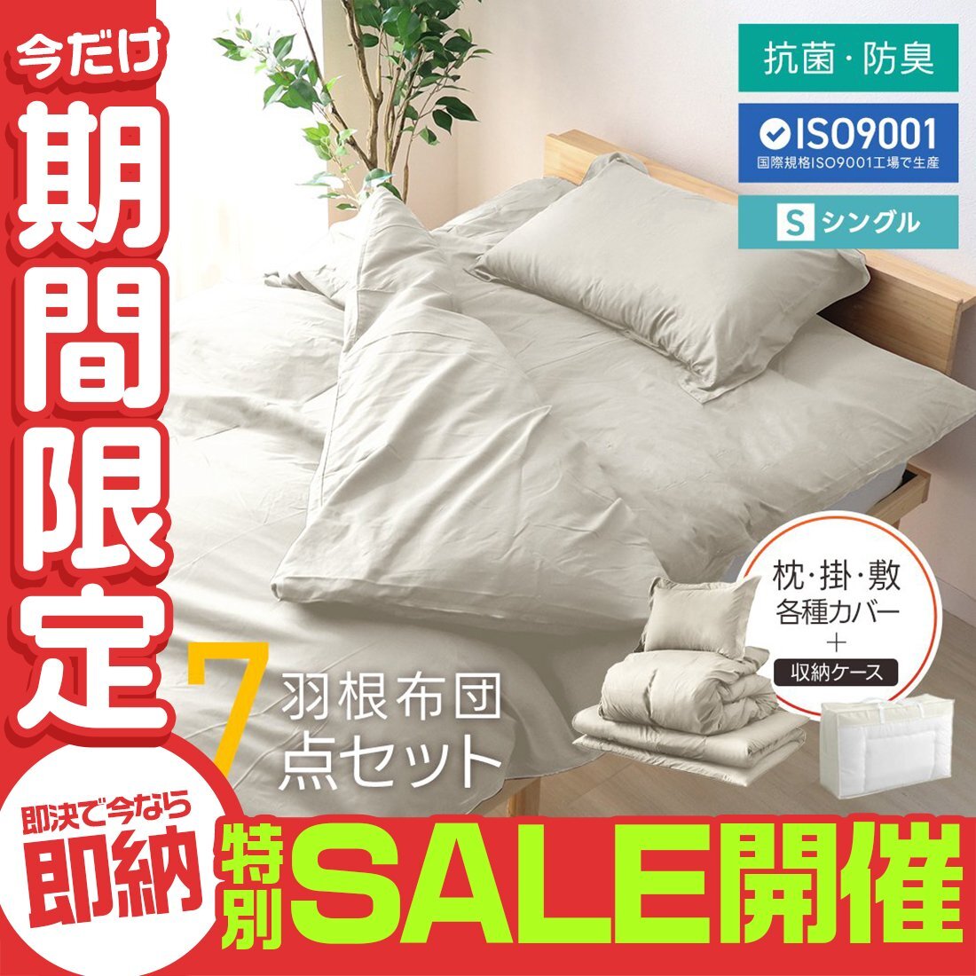 ISO9001認可工場で生産された安心の品質! 届いてすぐ使える寝具6点+収納ケースの7点セットです。 掛け布団は高級布団などにも使われるフェザーを100%使用! 冬場は暖かく、夏場は蒸し暑くなりにくいため、オールシーズン快適に過ごせます。 敷き布団はフローリングや畳の上に直接敷いても痛くないよう、 芯のある固綿を、ふんわり柔らかな中空ポリエステル綿でサンドイッチした三層式構造を採用! 底付き感を感じないボリュームで、快適な寝心地とふんわり優しく包みこまれる気持ちよさを実現! また、抗菌防臭加工が施されており、いつでも清潔に使えます。 \すぐ使えるから、こんな方におススメ♪/ ・一人暮らしや新生活を始める方 ・新生活を始める方 ・来客者用の布団一式を考える方 ・布団、寝具の買い替えを考える方 ・社員寮など業務用として考える方 【商品内容】 掛け布団、敷き布団、まくら、掛け布団カバー、敷き布団カバー、まくらカバー、収納ケース 【商品詳細】 カラー:ベージュ サイズ:シングル(詳細は画像参照) 素材:ポリエステル、フェザー |