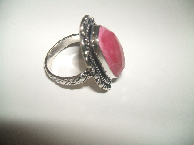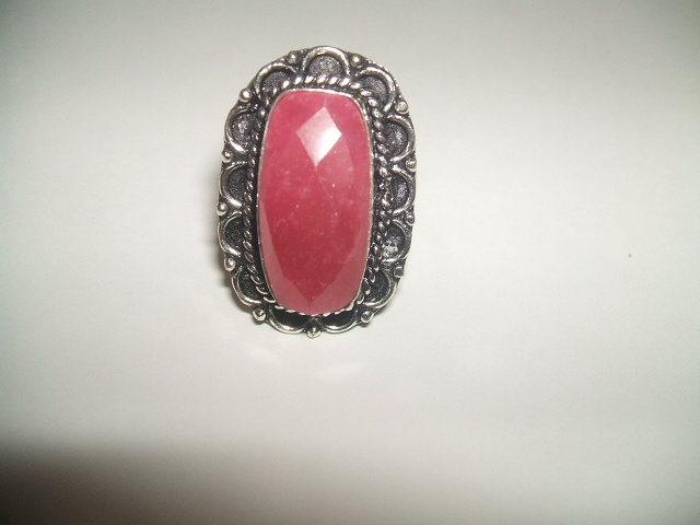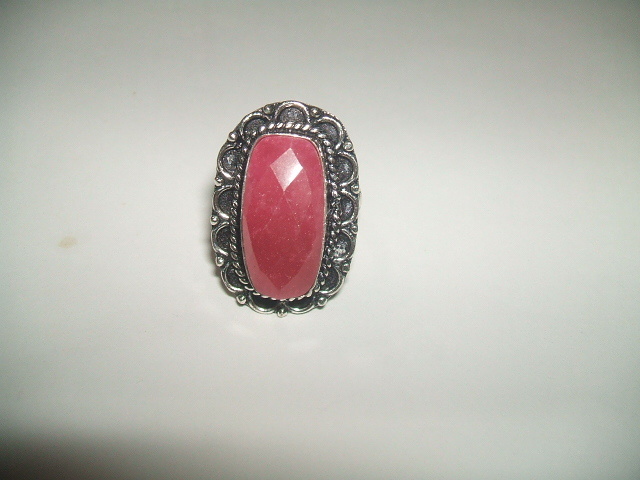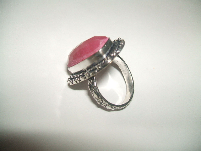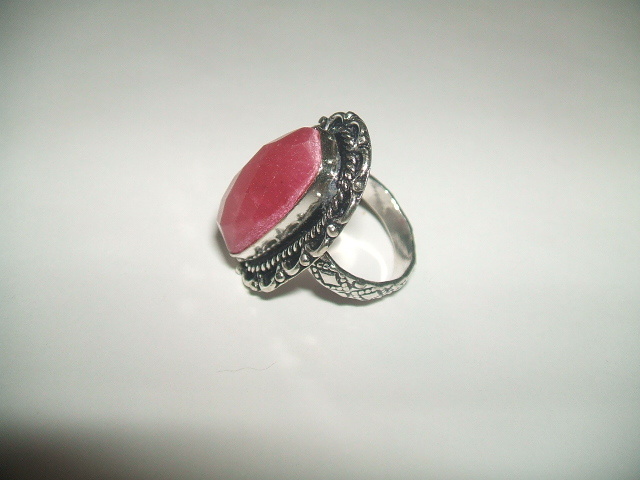 細長いアンティーク風デザインのルビーリングです。ルビーの大きさは2.1x1センチ。石の表面のカットによりキラキラとした輝きがあります。金属はシルバーで925の刻印があります。