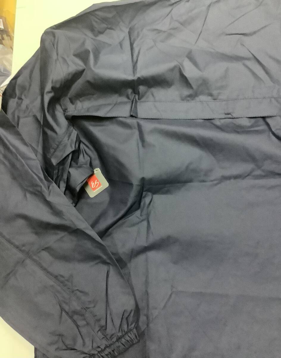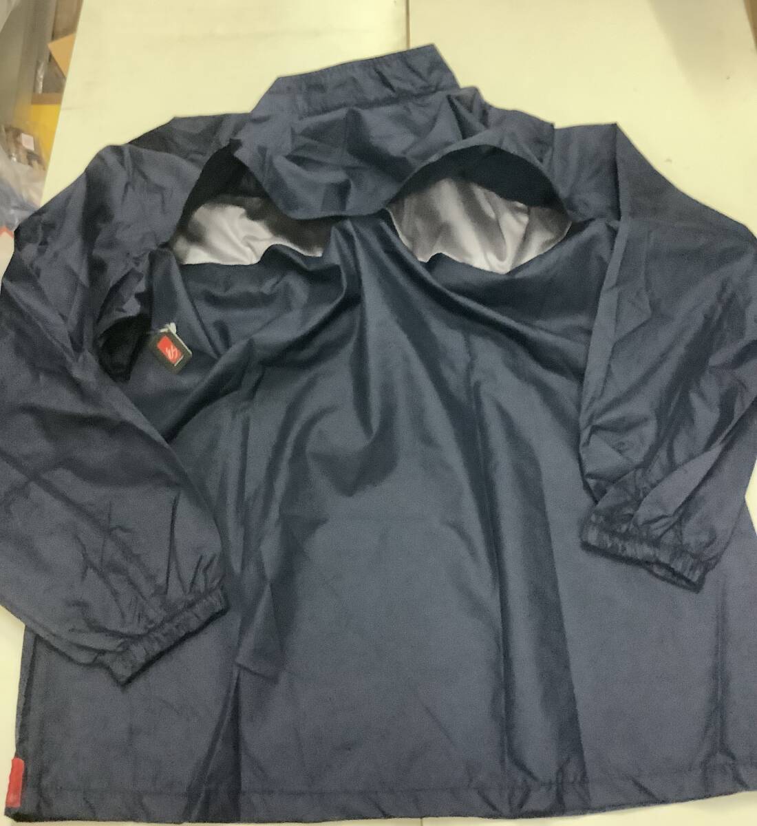 Made in USA ネイビーのフルジップウィンドジャケット、袖口ゴム仕様で快適な着心地。