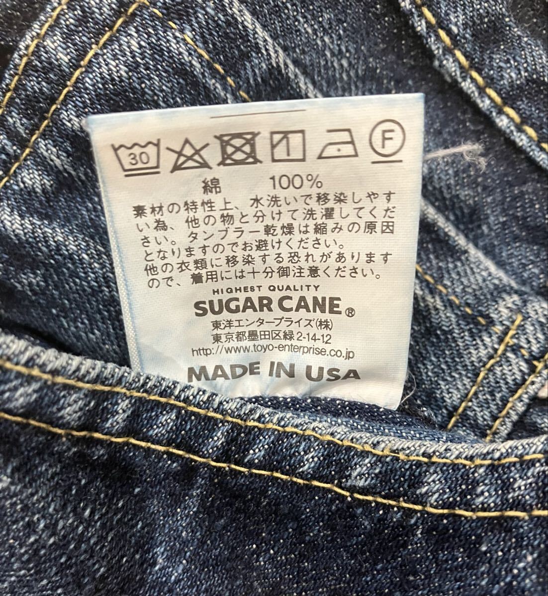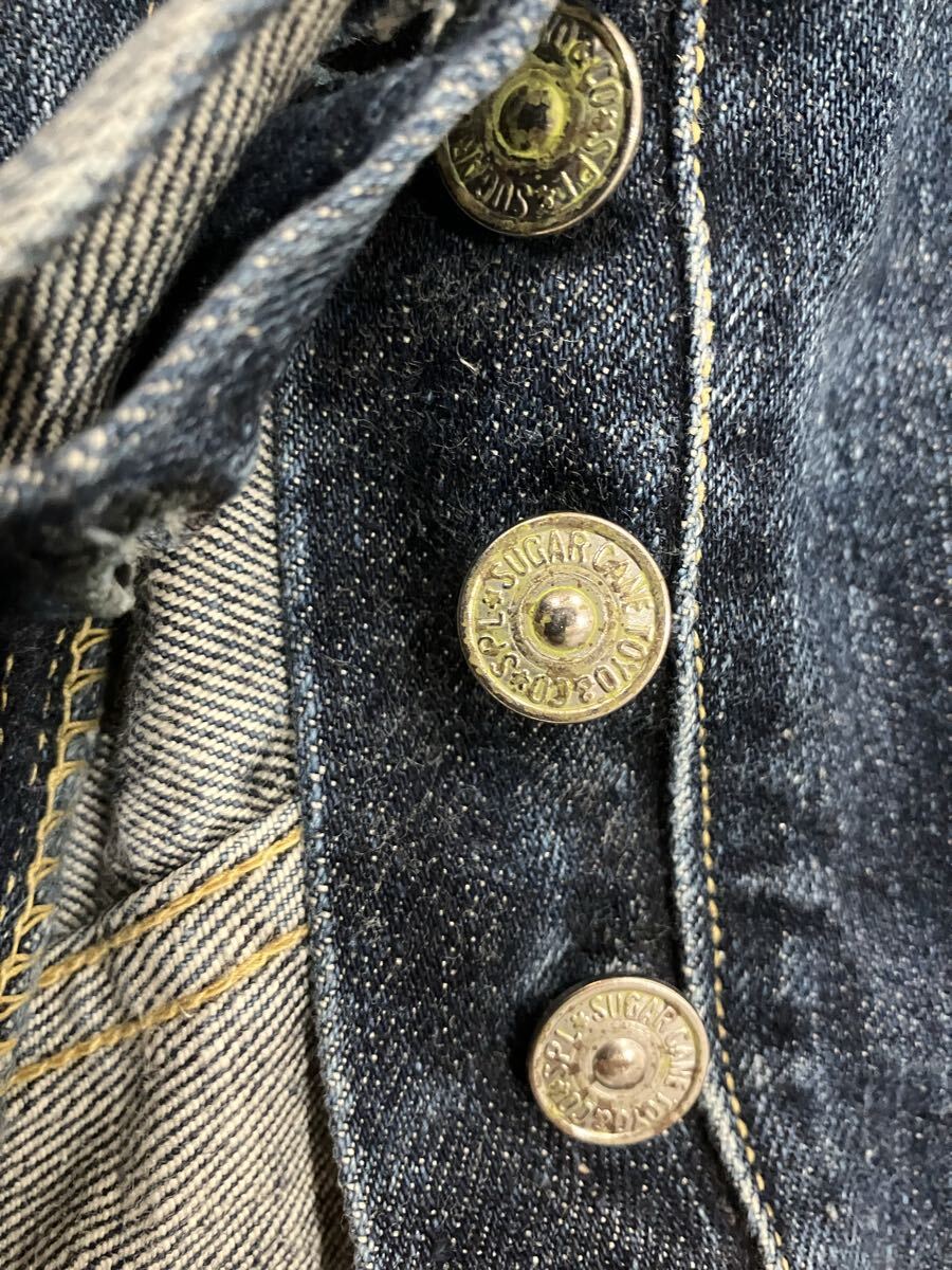 使用している生地はシュガーケーンオリジナルの13oz.デニム。現在では加工して節を作る「ネップヤーン」が主流だが当時の技術に合わせるため、紡績の段階で調整を行い、通常削ぎ落とされる短い綿や屑を残す事に成功。こちらの紡績による7番手のムラ糸を使用しシャトル織機で織り上げた。セルビッジは両端で赤とピンクの2色を使い分けている。経糸のピュアインディゴを染色する際、濃度を上げると通常は赤味を帯びてしまうが、赤味を抑えつつ特濃に仕上げることでヴィンテージの色味を再現した、