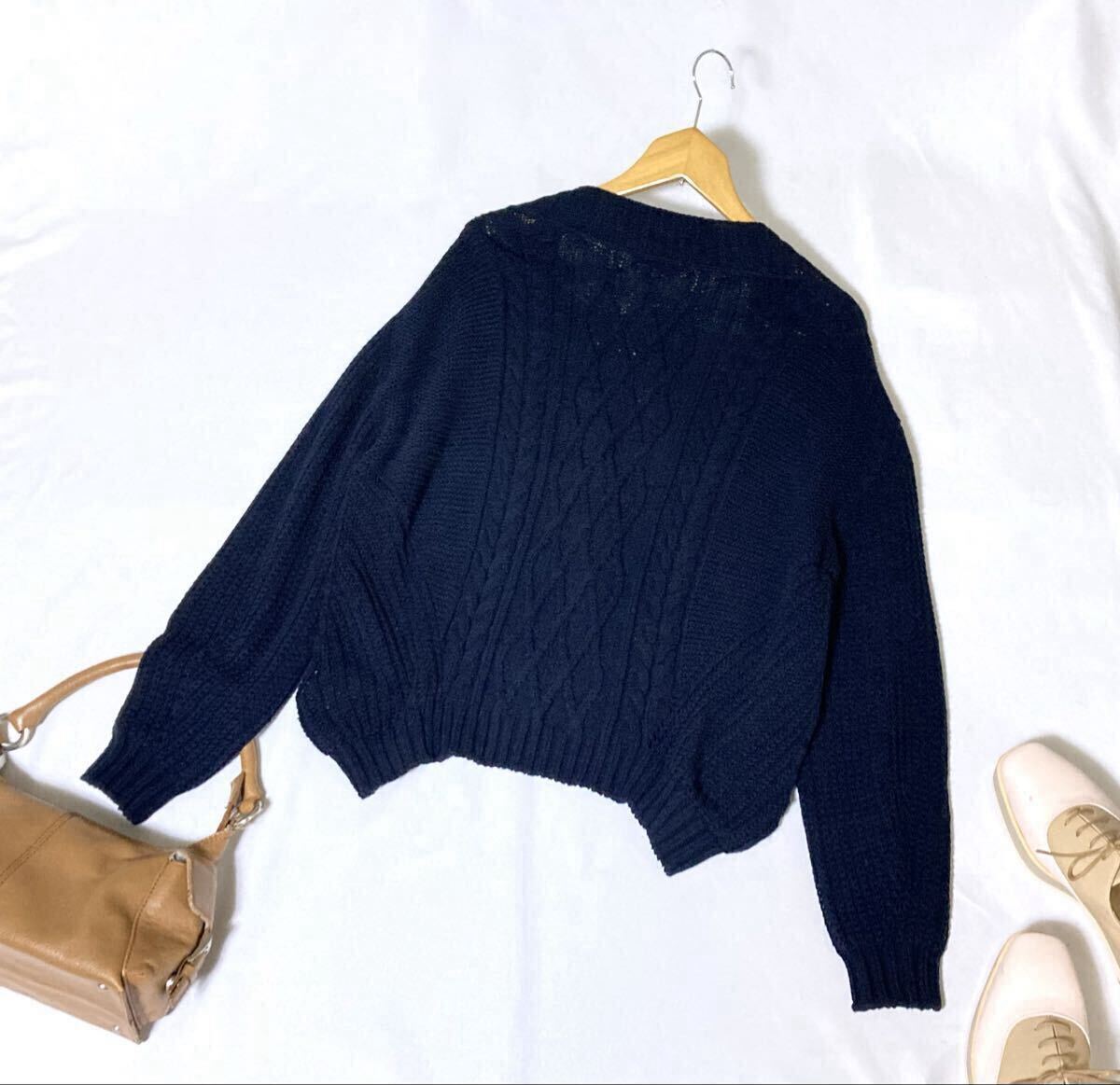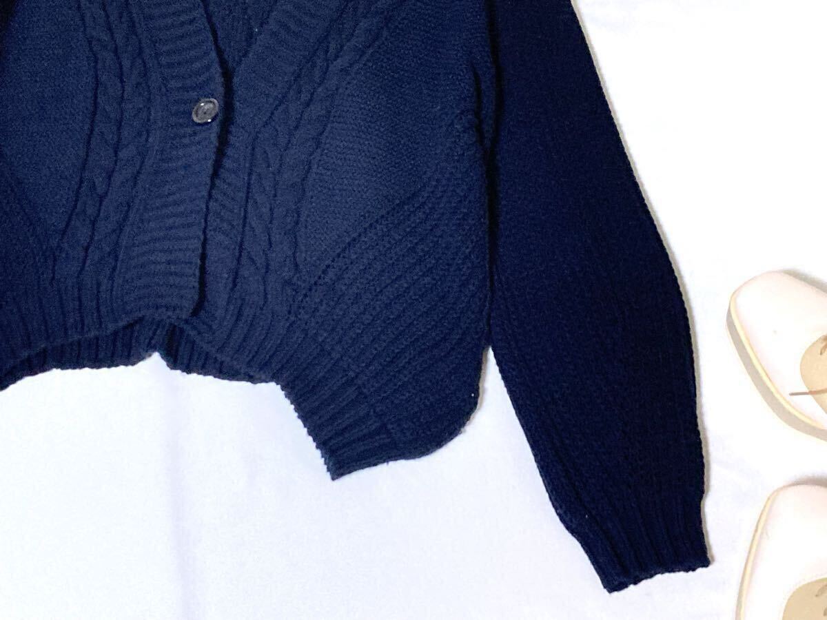 おしゃれなケーブルニットのカーディガンです。後ろはアラン編みになっています。一つボタンでゆったりしたデザインです。