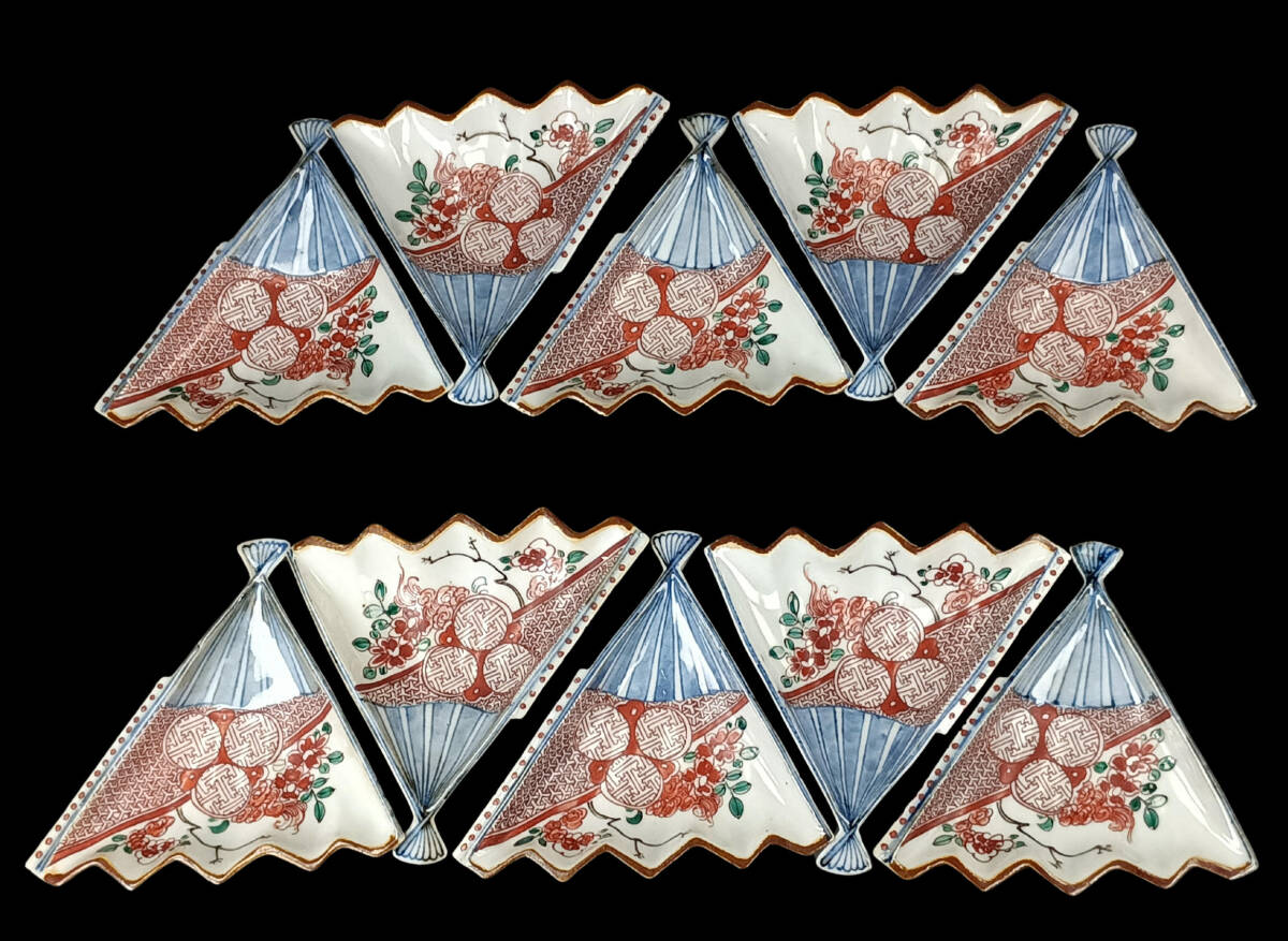 【偲】古九谷 八十吉 染付 赤絵 小皿 扇面半開小皿 10客揃 扇形 共箱 直径約12㌢ 高さ約2.7㌢ j-257