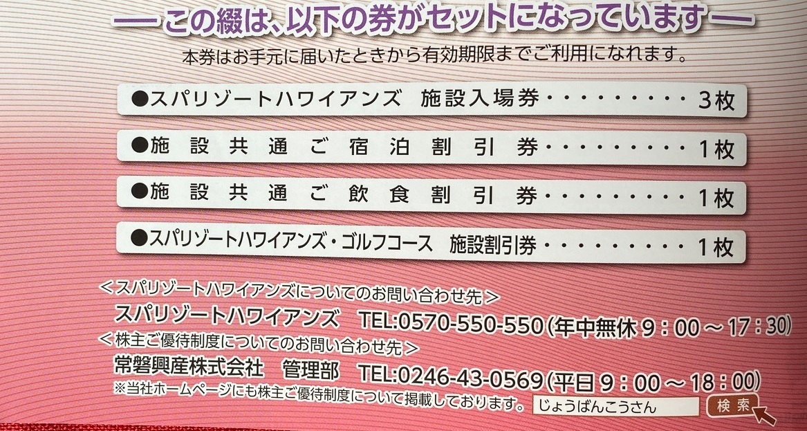 【M】常磐興産 株主優待券 スパリゾートハワイアンズ 100株以上500株未満 施設入場券3枚綴り他 1冊 有効期限:2025/12/31