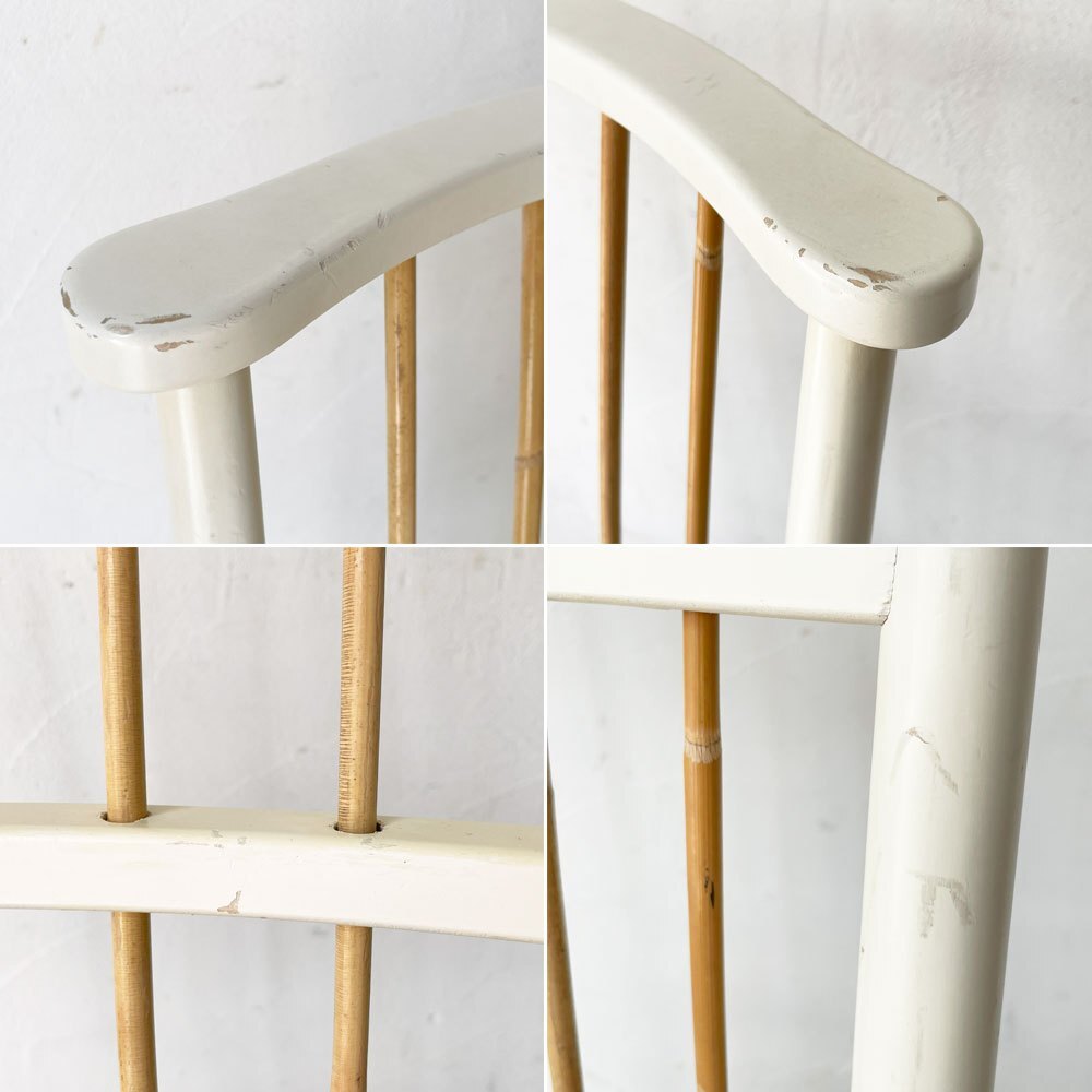 | コンディション | フレームに経年による僅かな色合いの変化があり、各所に傷やそれに伴うペイントロス、染みが見受けられます。また取り切れない汚れなどがございますが、いずれもビンテージ家具のようなシャビーな風合いとしてお楽しみ頂ける程度の物となっております。座面は弊社にて新品の生地に張り替え、スポークの竹も同素材で作り変えておりますので、今後も気持ちよくお使い頂けます。 ※特筆すべきコンディションは出来るだけ記載させて頂きますが、細かい擦れや傷、汚れ等を完全にお伝えする事は出来ません。画像をご確認の上、ご入札をご検討下さいませ。 ※取扱説明書や保証書等は記載が無い限り付属いたしません。 |