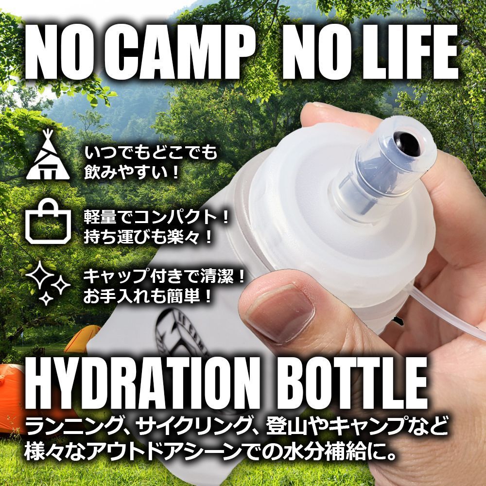 バックパッキングしやすいサイズ感。ソロキャンプや登山などUL(ウルトラライト)キャンプなど様々なアウトドアシーンに。緊急時や災害時の備え、プレゼントにもおすすめ。本製品は日本の検査機関にて素材・品質検査に合格した安心してご使用いただけるハイドレーションボトルです。
