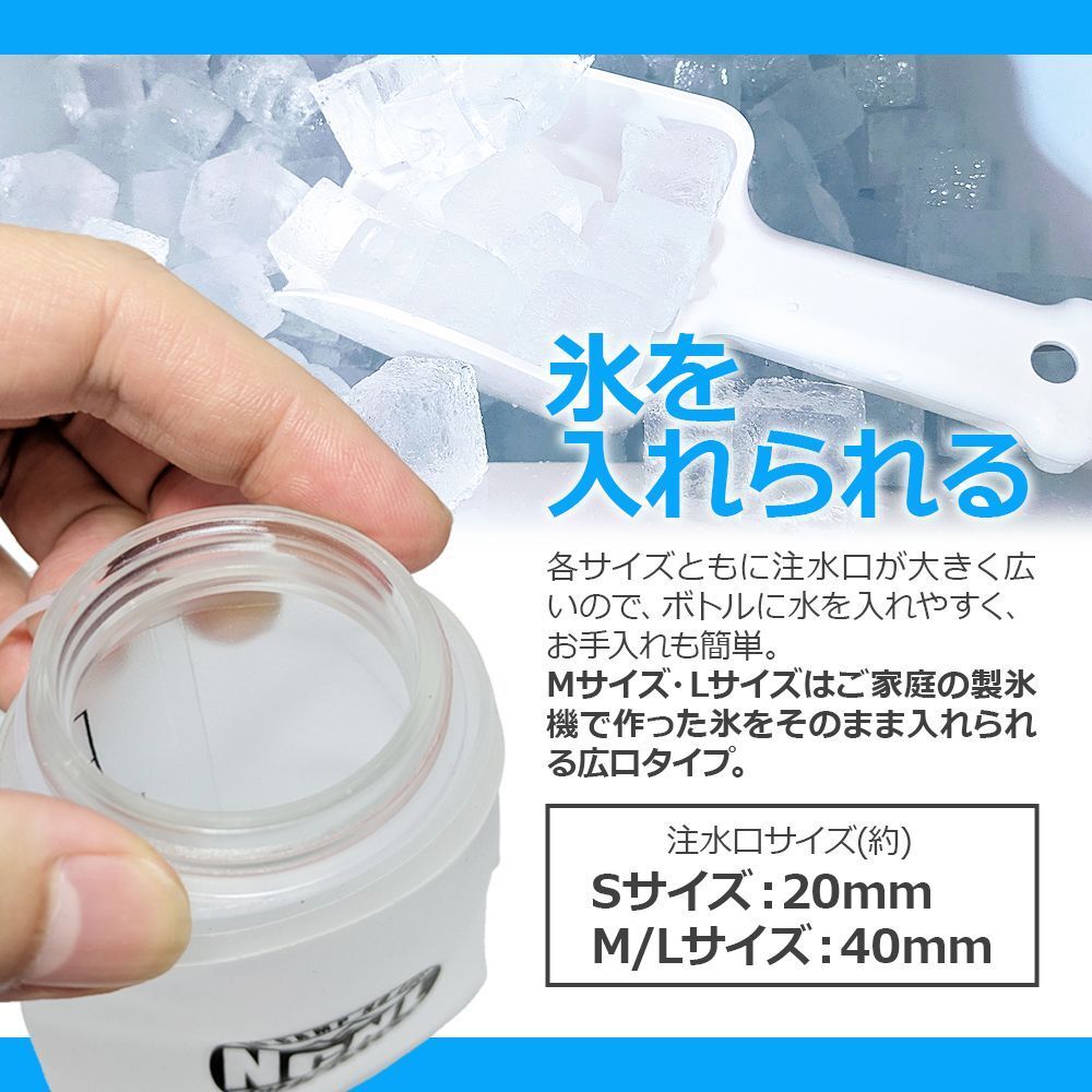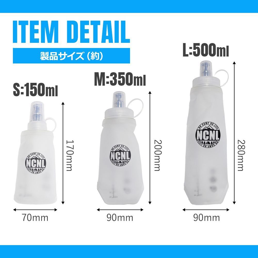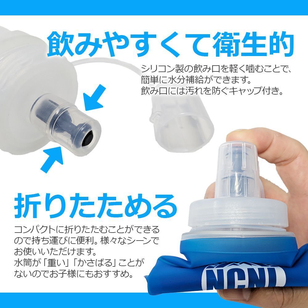 ショートランから長距離トレイルまで。飲みやすくて衛生的なソフトフラスク。キャンプ、マラソン、ランニング、ハイキング、サイクリングなどでの水分補給に。噛むだけで水が出るので、吸う力が弱くても簡単に水分補給ができます。M(350ml)サイズとL(500ml)サイズは広口タイプの注水口なので、ご家庭の製氷機で作った氷をそのまま入れることもできます。