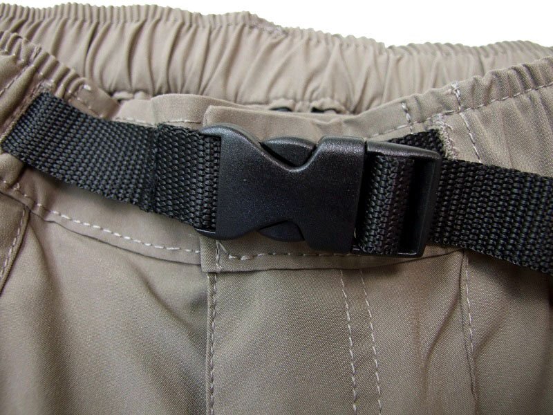 フロント開閉はジップ式。ウエストはサイズ調節可能なウェビングベルト、ゴムで伸縮する機能性に長けたディテール。