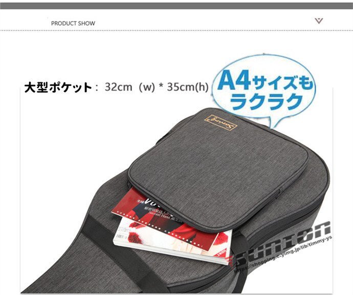【商品特徴】◎肉厚で使い勝手の良いアコースティックギター用ギグケース◎肉厚なクッションにより愛用の楽器を衝撃から守ります。◎リュックタイプの両肩背負いが可能で、他の荷物が多い移動時にも便利。 手提げスタイルにも対応しております。◎収納ポケットが搭載されており、楽譜や教本、チューナーや予備弦などを収納可能。【商品スペック】◆素 材 厚手の600Dオックスフォード素材(撥水効果) 中 部 25mmフォームパッドを採用(ギターを保護)◆外 寸(内寸) 41インチ 105×41×12cm39インチ 103×40×11.5cm36インチ 93.5×37×10cm◆移動対応 2WAY/手提げ&肩掛けに対応