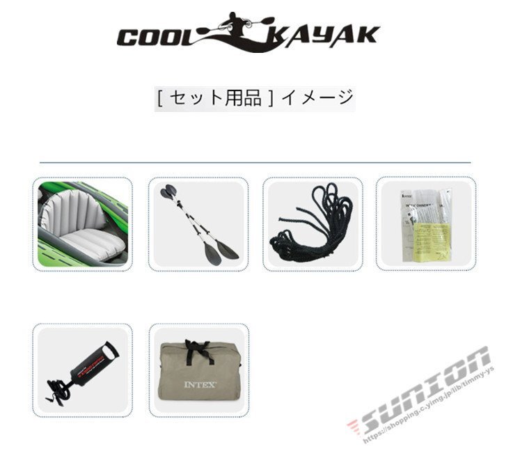 【商品SPEC】■サイズ:約351×76×38cm■重量:17.5kg■素材:0.75厚耐久性pvc■適応体重:180kgまで■包装サイズ:約60×35×42cm■セット内容:本体、バッグ、手動ポンプ、シート×2、パドル×2、フィン×1、修理キット×1●持ち運びや保管に便利な、2人乗りインフレータブル式カヤック。●カヤック本体とイスを膨らませて取り付けるだけの初心者に最適な簡単構造。●角度の調節できるインフレータブルシートにより数時間のパドリングも楽々。●フロアに設置されたドレンバルブにて船体に入った水を排出し、最適な量に調節することが可能です。