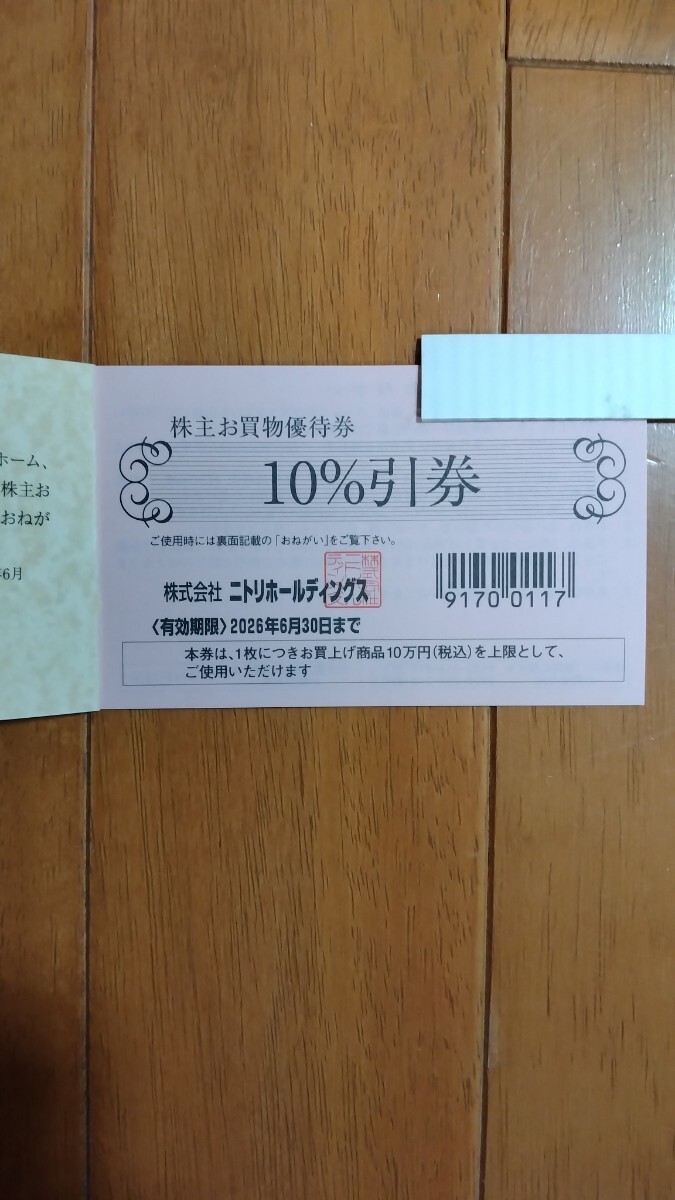 ニトリの株主優待 10%引券 お買物優待券1枚です。