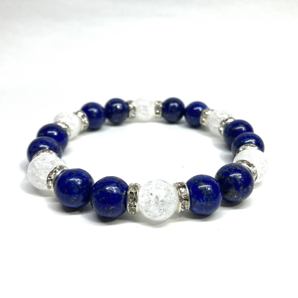 こちらは、ラピスラズリとクラック水晶を組み合わせたパワーストーンブレスレットです。間にはロンデルを挟み高級感あるデザインに仕上げております。石大きさは腕にも馴染みやすいように10mm玉で内径約18cm(伸可能)です。(サイズ変更の場合は取引ナビにてご連絡をお願いします。) 数に限りがございますので気になる方はお早めにどうぞ。
