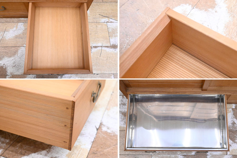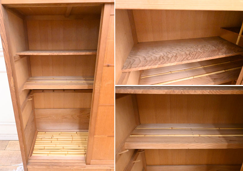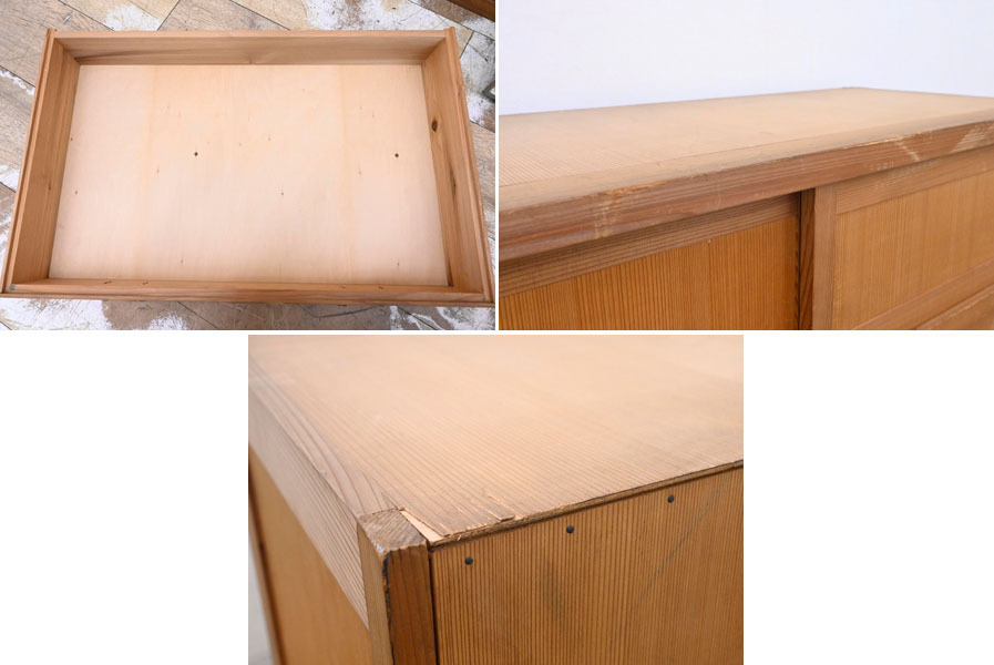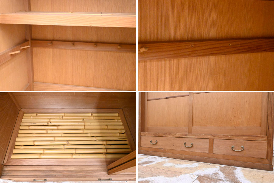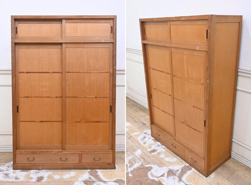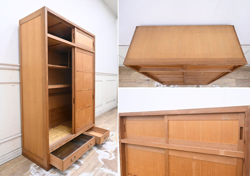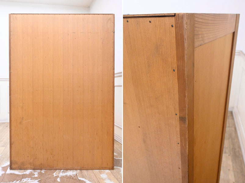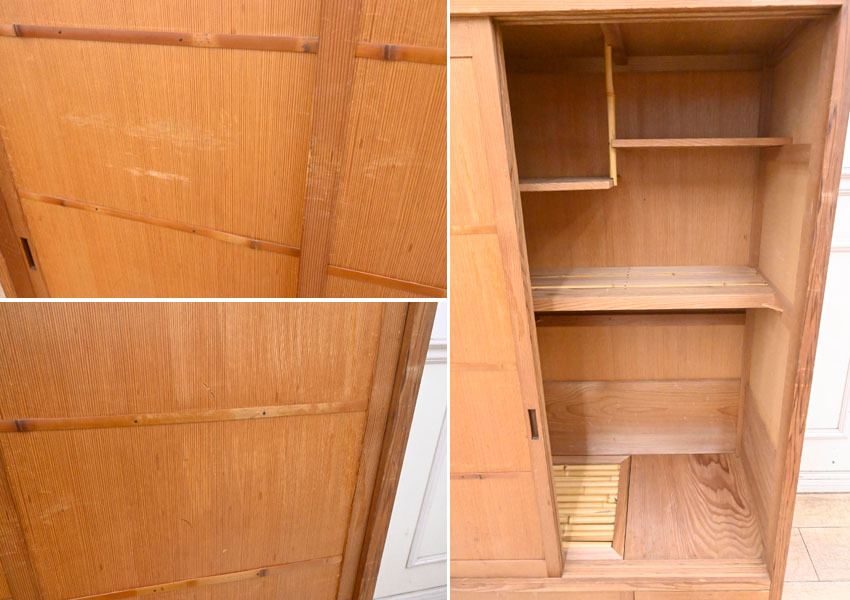 ----------------------------------------------------------------------------------------- ●送料や注意事項は必ずご確認下さい。落札後にトラブルになるケースが増えております。● ◆コンディションは写真・文章にて記載して有りますが、全てのキズの写真は掲載致しておりません。大きなダメージを除き見落とし、記載漏れが有る事はご了承下さい。 ◆当サイトにて出品する商品は多種多彩で、当方商品知識の無い物も多数ありますので落札後の質問やメンテナンス等にはお答えできません。 ◆入札された時点で、画像、文章をご理解していただいたものと判断させていただきます。不明な点は前もってQ&Aからお願い致します。入札後の質問やお電話等でのキャンセルは一切受け付け致しません。 ◆商品説明に「ノークレーム」と記載しているものに関しては、如何なる状況で届いても保証致しません。詳しくは注意事項の「商品到着後について」の最後に記載しておりますのでご確認下さい。 ---------------------------------------------------------------------------------------- 年代のキズ、ガリキズ、薄汚れ、多少のシミ、内部引っ掛け棒2ヵ所取れている所、天板向かって右後ろ角にメクレ、バリ、扉前面擦り傷、ガリキズ等有ります。 幅94 奥38.5 高140cm | ||