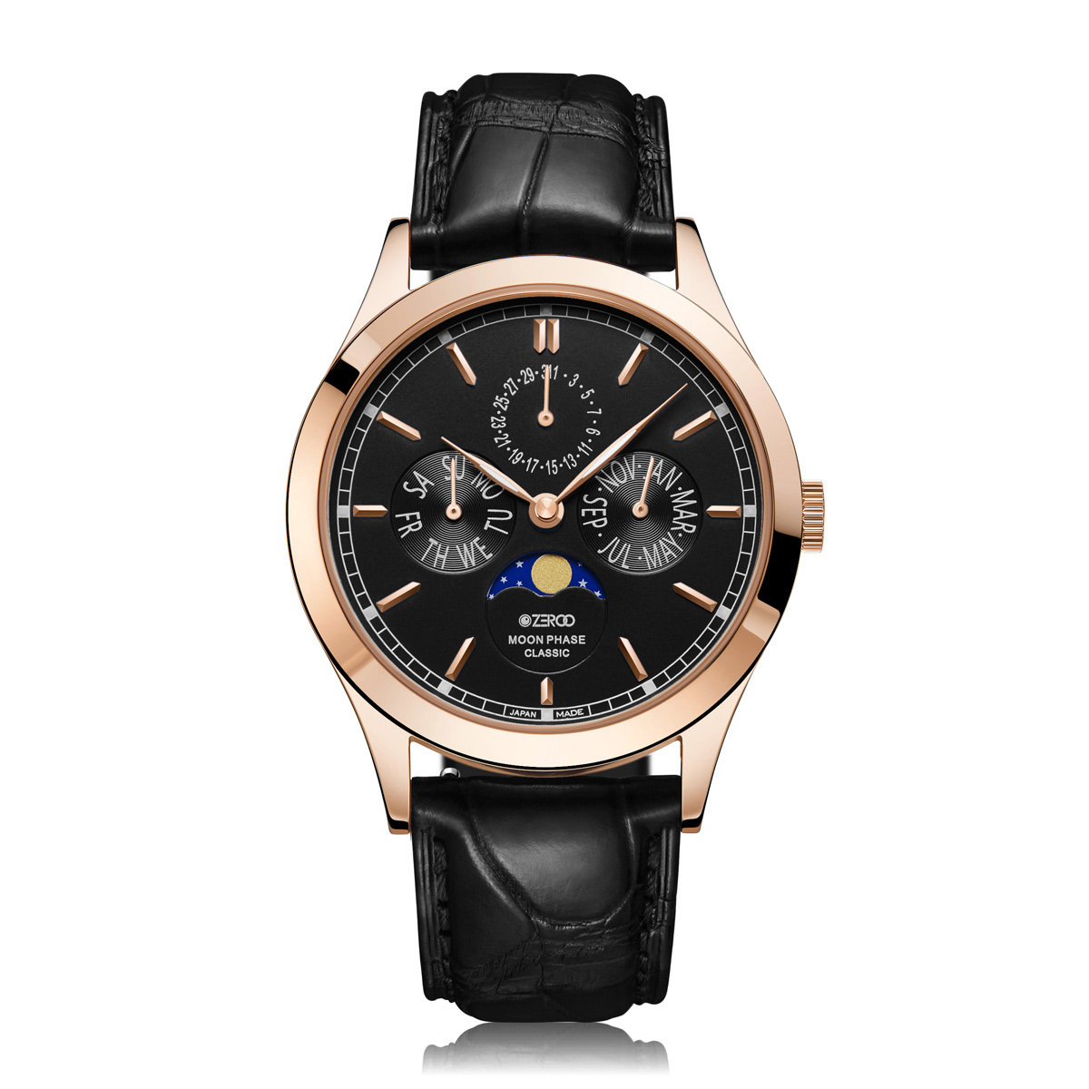 ●品番:ZC001RBK ●ブランド名:ZEROO ●シリーズ名:CLASSIC ●ムーブメント:電池式クォーツ(Miyota No.6P00) ●表示タイプ:アナログ ●風防素材:サファイアクリスタル ●盤面表示:分, 時, 日, 曜日, 月 ●文字盤形状:丸型 ●文字盤カラー:ブラック(黒) ●ケース素材:ステンレススチール ●ケースカラー:ローズゴールド ●ケースサイズ:38mm ●ケース厚:9mm ●裏蓋:圧入式 ●ベルト素材:本革 ●ベルトカラー:ブラック(黒) ●ベルト取付幅:20mm ●バックル:Dバックル ●腕周り最大:185mm ●腕周り最小:140mm ●重量:62g ●耐水圧:3ATM ●機能:ムーンフェイズ(月齢表示)/ カレンダー/ 夜光表示 ●付属品:メーカー保証 24ヶ月/純正ケース ●スタイル:ビジネス/シンプル,ファッション,カジュアル ●対象:男女兼用(メンズ/レディース) ●備考:CLASSICシリーズの第一弾モデル。Moon Phase搭載。月相(月の満ち欠け)を知る楽しみを味わえます。曜日、日、月のカレンダー機能が、ダイアルをエレガントに仕立てます。 |