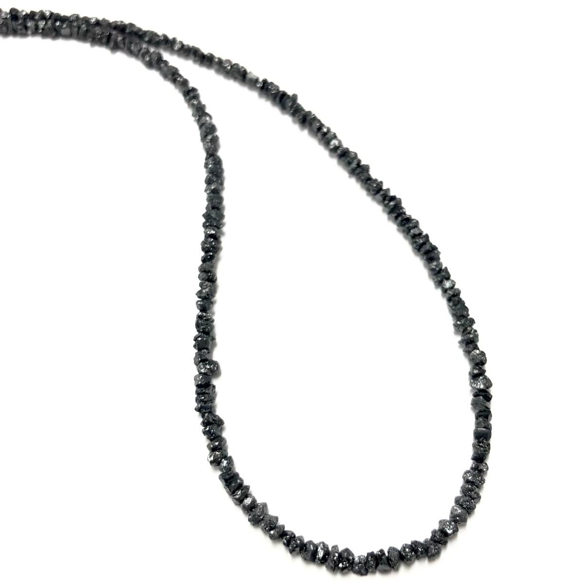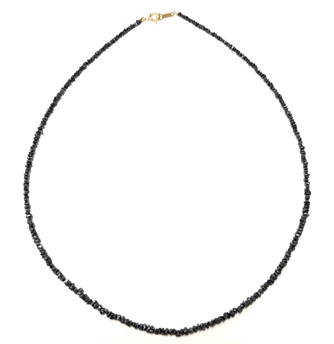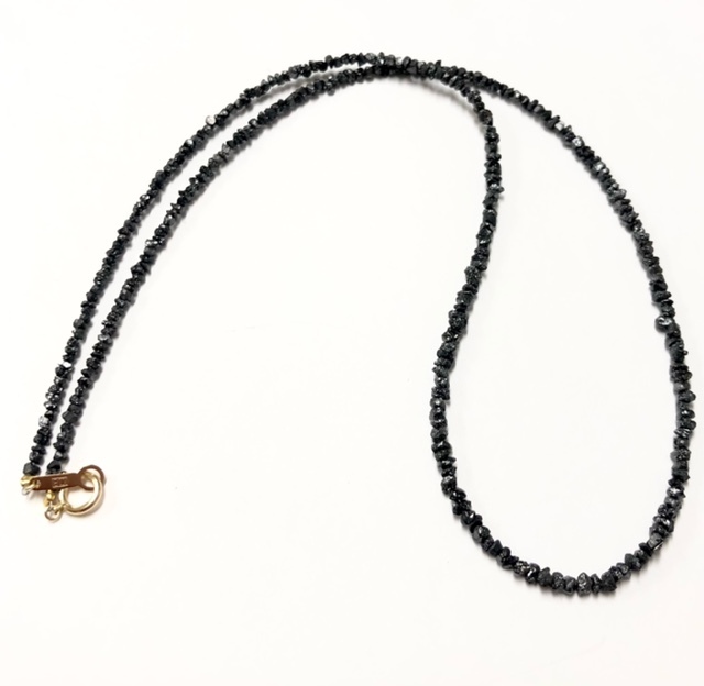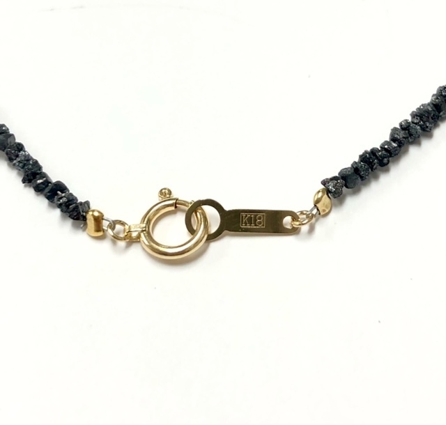 ※別途5500円で鑑別書発行可能です。 ブラックダイヤモンドは悪魔も欲しがると言われるほど、強いパワーに満ちた石です。あらゆる石の中で、黒色は非常に貴重な存在であり、そのため強い力を与えてくれる石とされています。 例えば恋愛では、パートナーに深い愛情を注ぐことができるようになるようです。ダイヤモンドと同じく、不滅の愛を意味する石でもあります。 自分の魅力をアップさせて好きな人から注目されやすくなる、というパワーも。 仕事においては継続する力や集中力をアップさせたり、リーダーシップを高めたりすると言われています。また潜在能力を引き出し、未来を切り開くパワーもあるとされていますので、経営者にも人気の石です。 さらに、個性を高める、日々の気力や情熱、やる気をアップさせる、カリスマ性を高めるなどさまざまなパワーや意味を秘めており、とても魅力的な石です。 ブラックダイヤモンド:2.5mm 15.0ct K18ヒキワプレート 長さ:約42cm | ||
