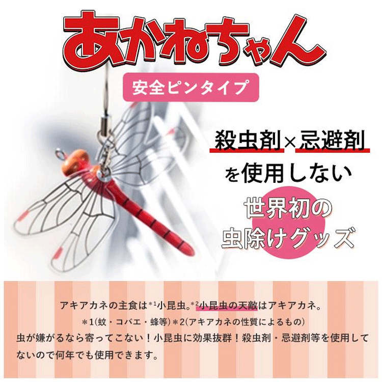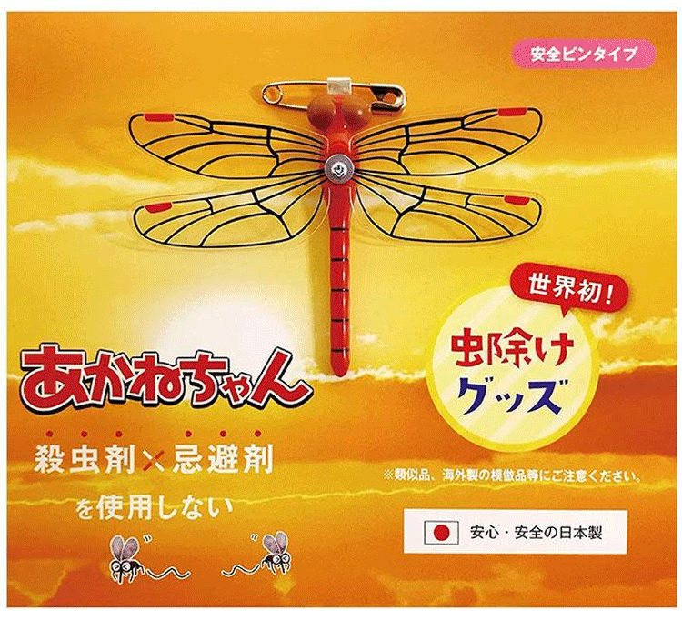 【商品特徴】 殺虫剤×忌避剤をしようしない世界初虫除けグッズ アキアカネの主食は小昆虫。小昆虫の天敵はアキアカネ。 虫が嫌がるから寄ってこない!小昆虫に効果抜群! 殺虫剤・忌避剤等をしようしていないので何年でも使用できます。 安全ピンタイプ ゴルフ・キャンプ、ベランダ・軒先、ベビーカー、オープンカフェ・飲食店 ・フックやカラビナ等で風通しの良い所に取り付けると効果的! ご注意 ・直射日光に長時間あたると、変色・色落ち・変形します。 ・小さいお子様のおもちゃとして使用しないで下さい。 ・強い衝撃を与えると欠損・欠落します。 ・火の近くで使用しないで下さい。燃えたり溶けたりします。 ・暗い場所ではあまり効果がありません。 ●商品名:虫よけグッズ あかねちゃん【安全ピンタイプ】 ●ブランド:EDISON GOLF ●パッケージサイズ:150×20×130mm ●重量:3g ※撮影時の光量の具合や、ご覧いただいております画面環境によりまして、実際の商品と若干色味が違う場合がございます。