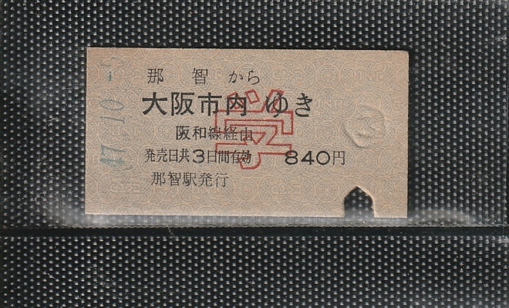 国鉄大阪印刷 那智から大阪市内 学割常備 A型 青地紋 硬券乗車券 下パンチ券