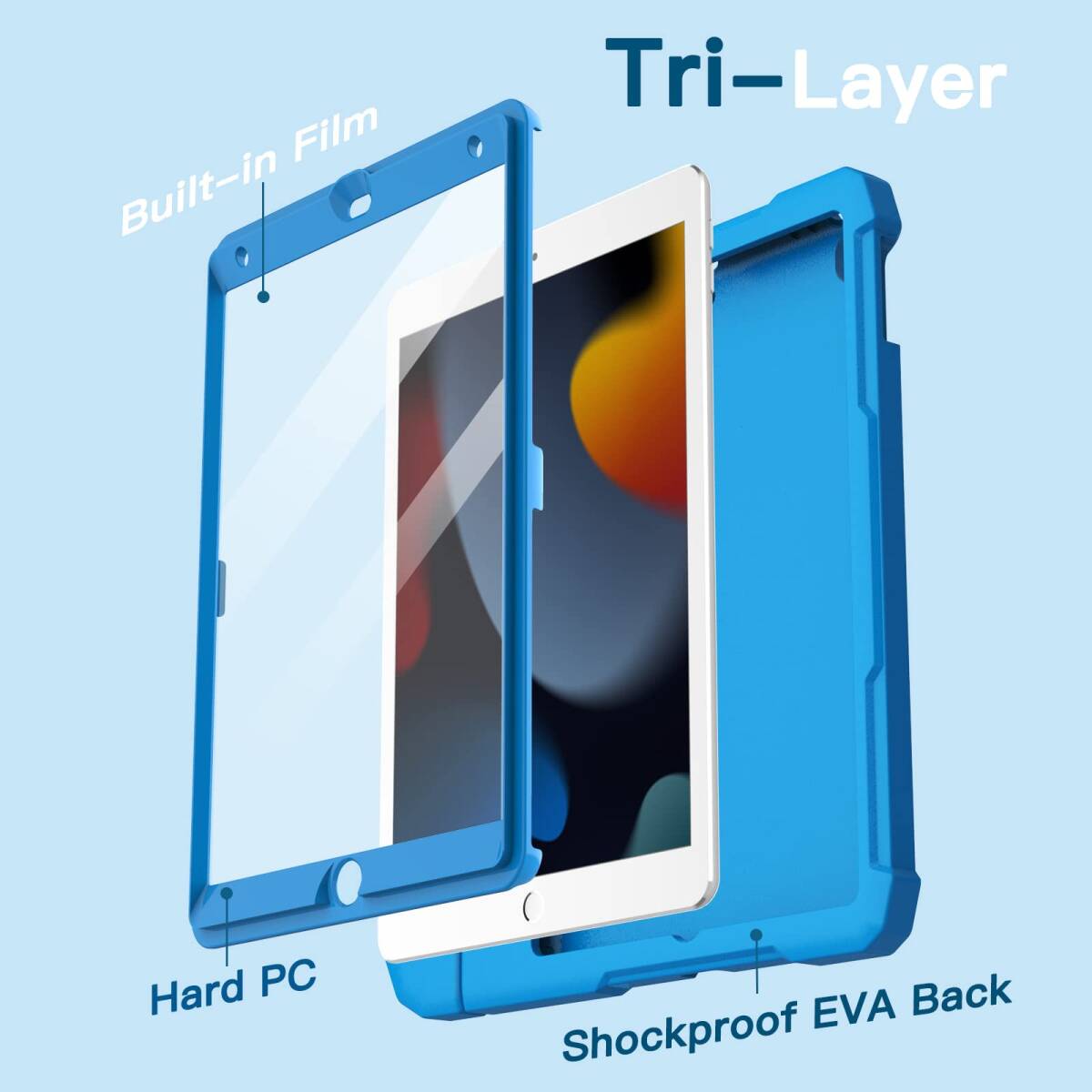 JETech 子供用 iPad 10.2インチ ケース (第9/8/7世代、2021/2020/2019) 液晶保護フィルム付き 耐衝撃 フルボディハンドルスタンド タブレット保護カバー (ブルー)