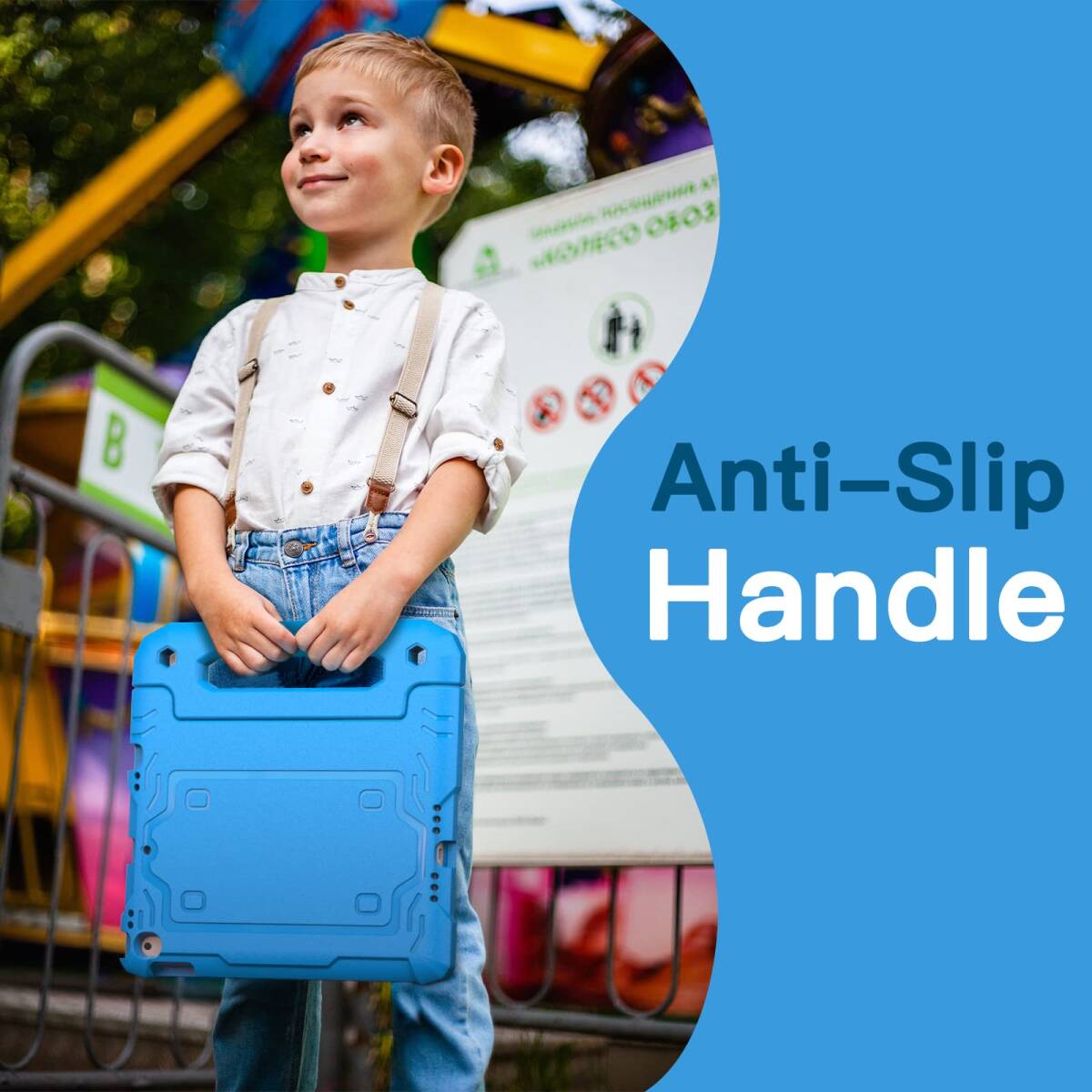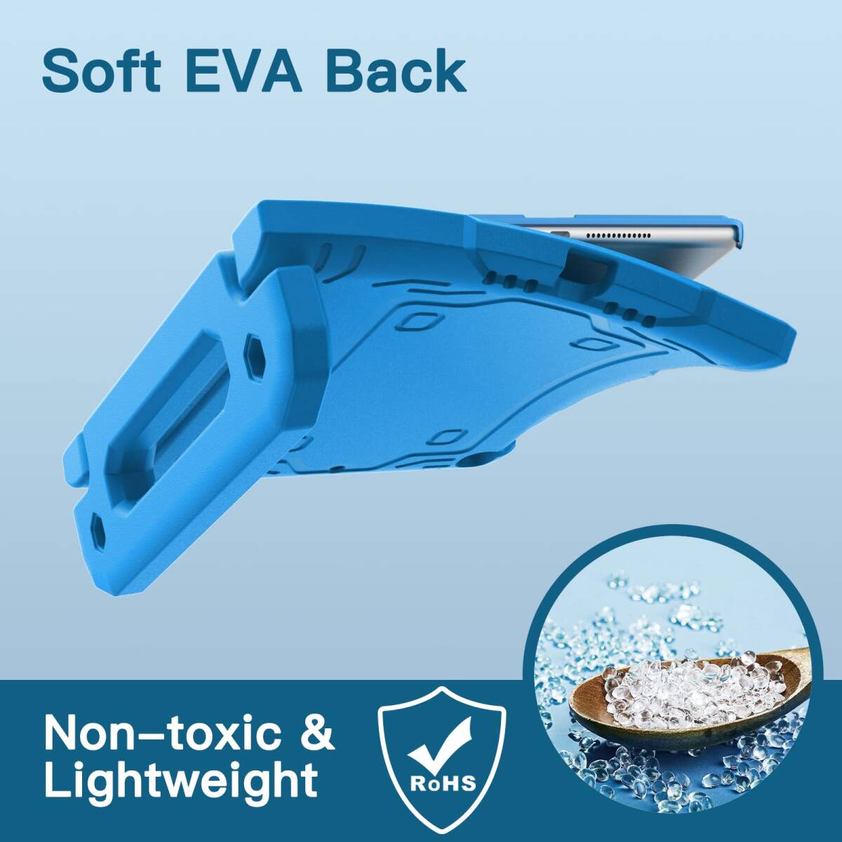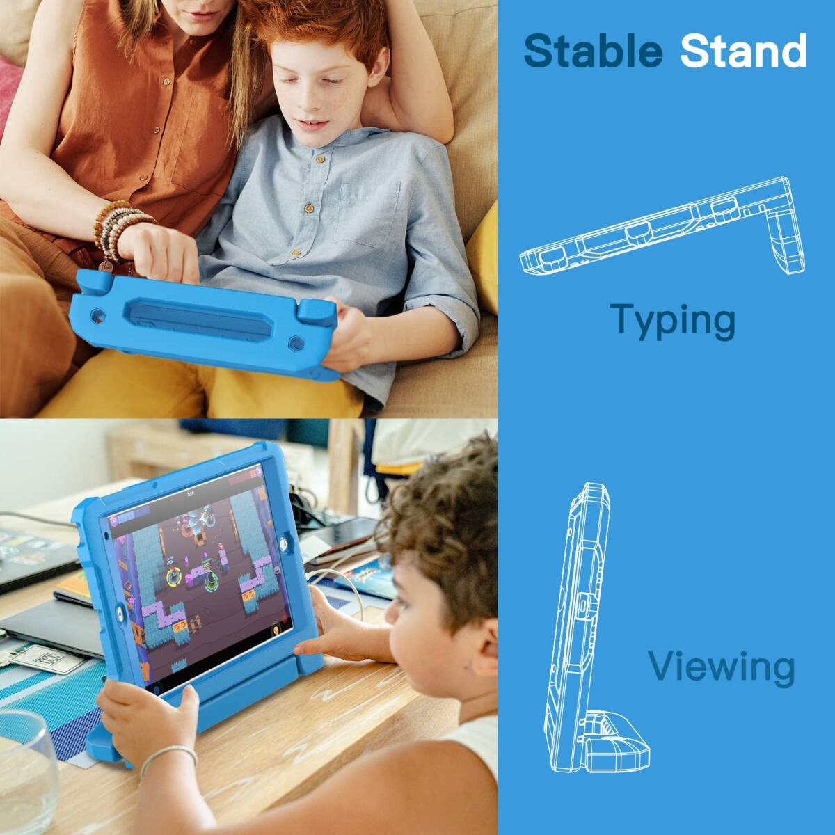 [多目的スタンド] 滑り止めの風合いで子供に優しいハンドルのデザインです。持ち運びやすいし、両手を解放して自由に視聴を体験するあるいは快適なタイピングのために折りたたんで、頑丈なスタンドに変えるのも易しいことです