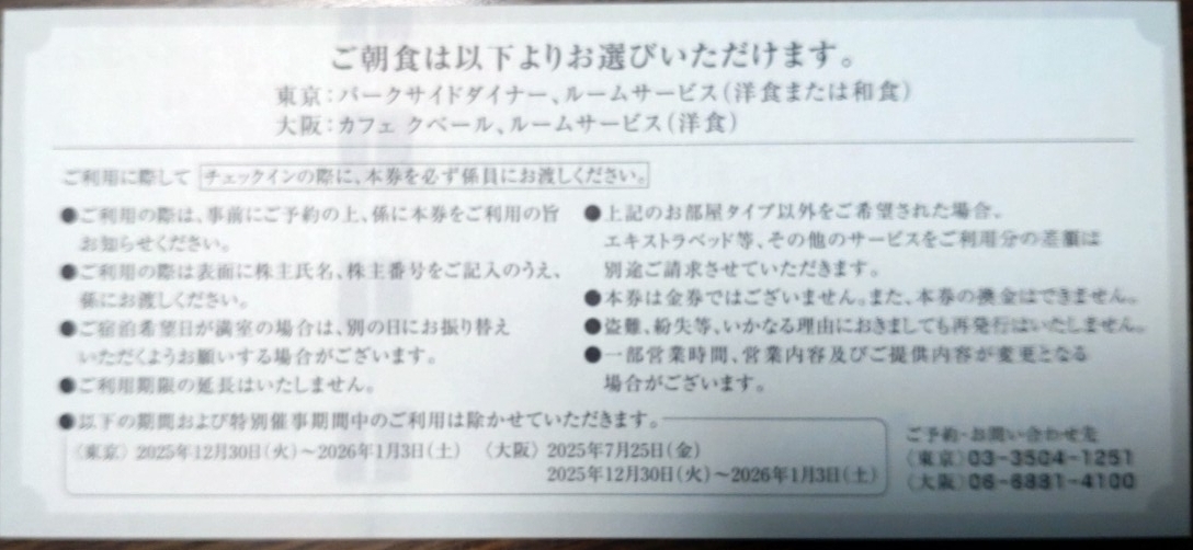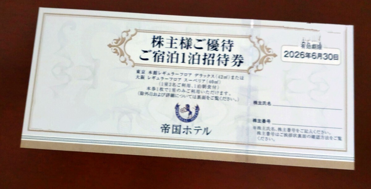 帝国ホテル1泊宿泊券朝食付き、1枚 有効期限2026年6月30日 株主優待