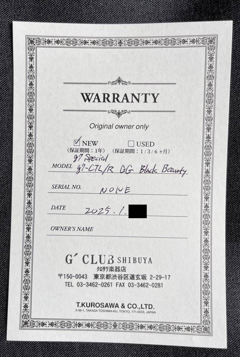 付属品はギグケースと保証書です。ギター専用梱包材で配送いたします。