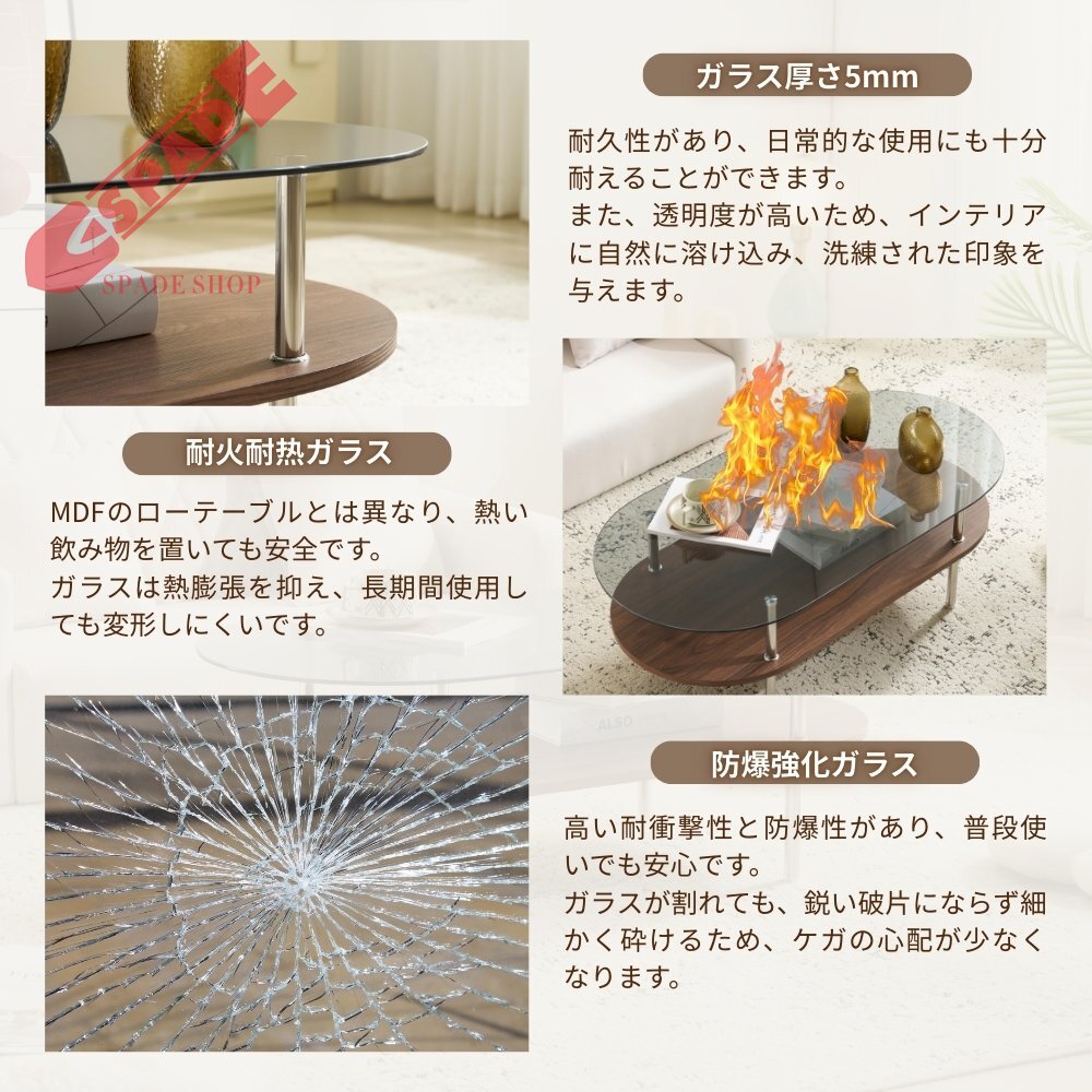 • 【安心の6mm強化ガラス採用】このテーブルの最大の特徴は、ガラス天板のデザインです。安全性を配慮しつつ、上品さを追求した結果、美しい透明な6mm強化ガラスにたどり着きました。耐荷重はそれぞれ、棚板最大45㎏、ガラス天板最大50㎏。しっかりとした耐久性のため安心して使用できます。