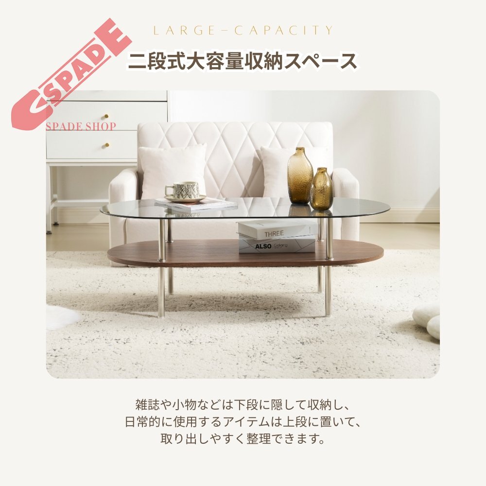 • 【二段式大容量収納スペース】下部には、大容量収納スペースを備えた二段式のデザインです。市場に出回っている他の二段デザインに比べて、このテーブルの収納スペースはより大きいです。雑誌や小物などは下段に隠して収納し、日常的に使用するアイテムは上段に置いて、取り出しやすく整理できます。