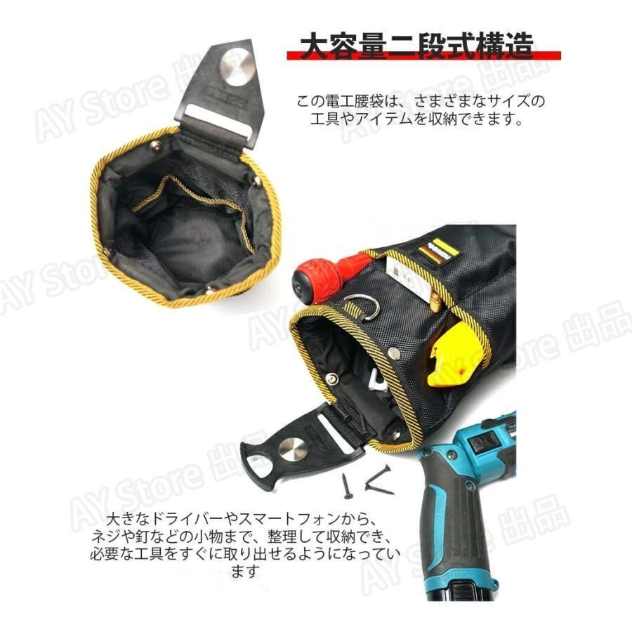この電工腰袋は、さまざまなサイズの工具やアイテムを収納できます。大きなドライバーやスマートフォンから、ネジや釘などの小物まで、整理して収納でき、必要な工具をすぐに取り出せるようになっています