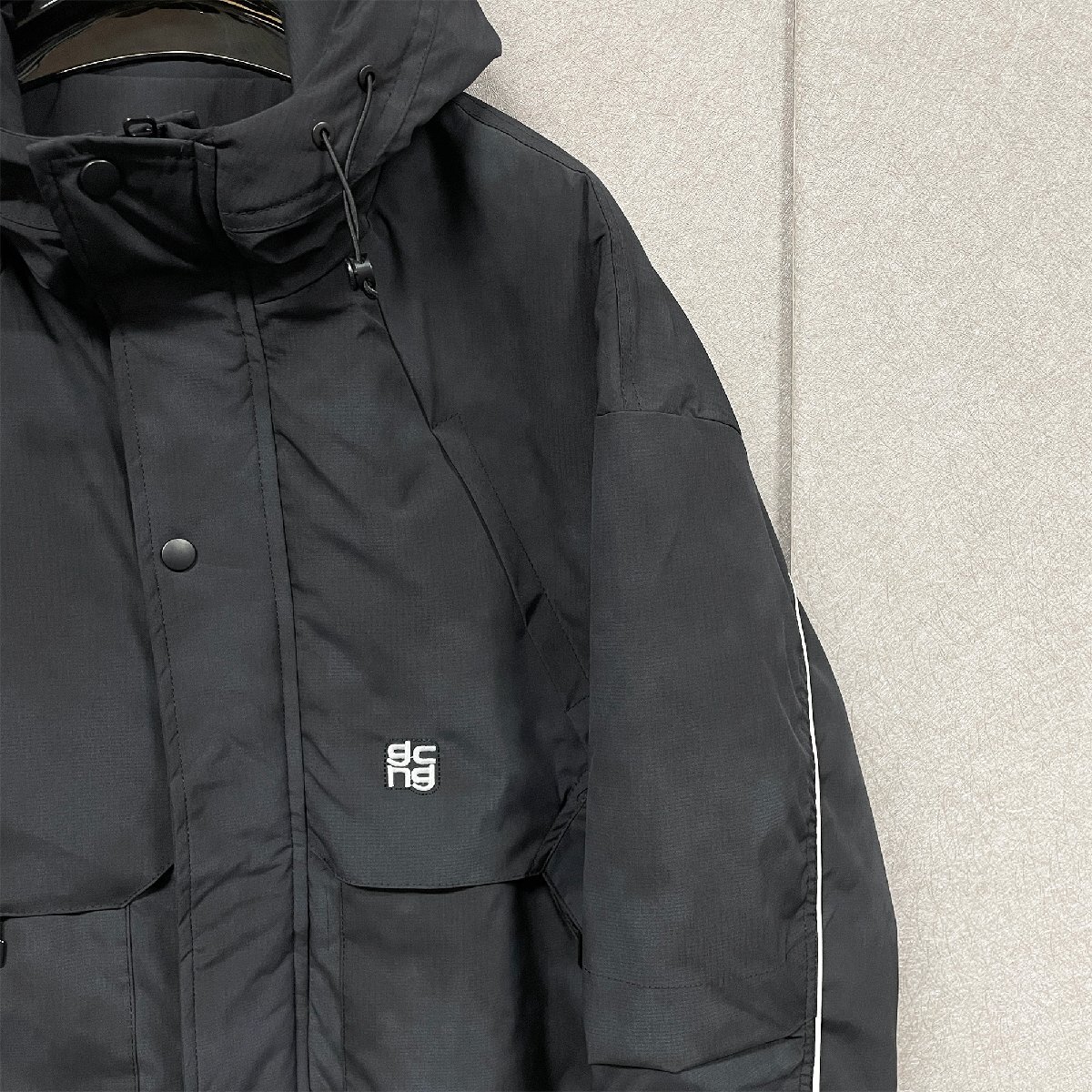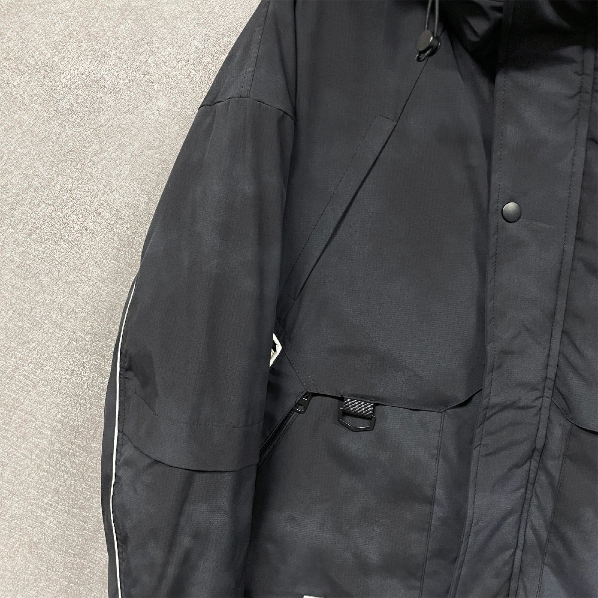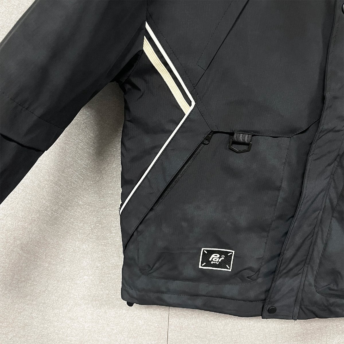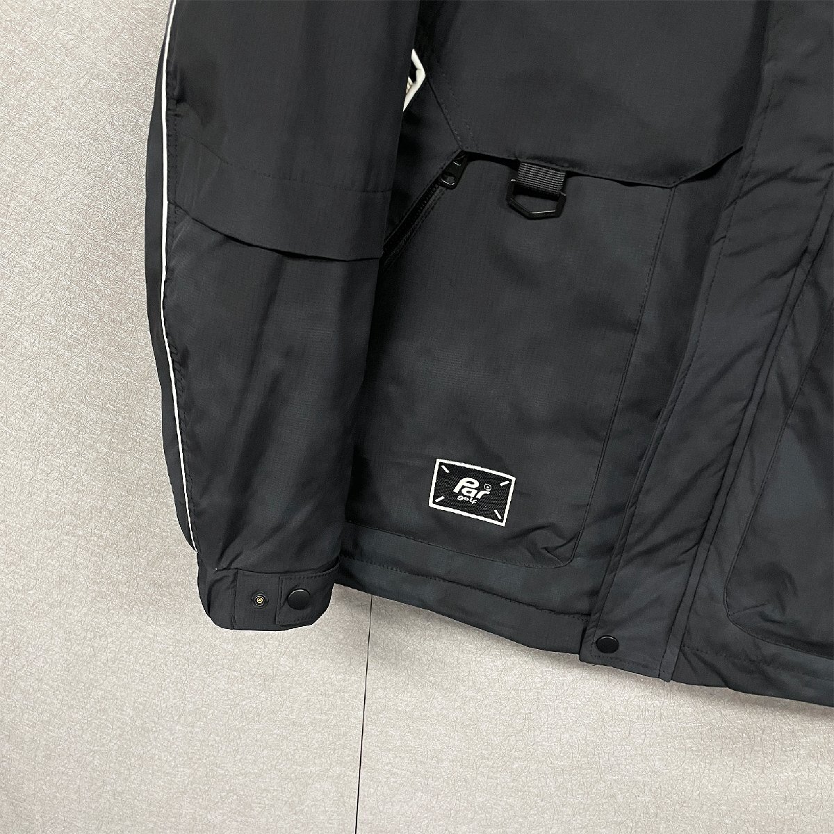 フロントファスナーを首元まで上げるとスタンドカラーになり、大きめのフードを追加することで寒さを防ぐことができます。バックに入ったストライプ柄はめっちゃカッコイイです。ジップアップジャケットの強みといえば、フロントを開けた着こなしと閉めた着こなしで雰囲気をガラリと変えられることです。フロントには大きめのポケットを装備しており、スマホや鍵などの物を収納できます。ポケットの開閉口はジッパー式になっていて、物が落ちにくく、安心感がたっぷり。