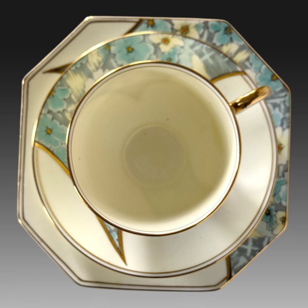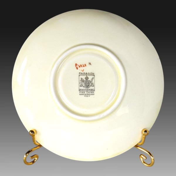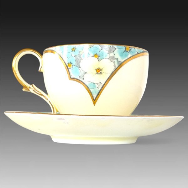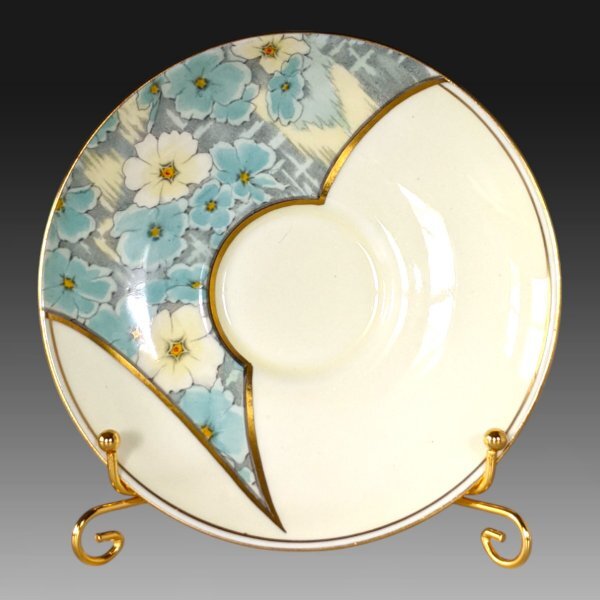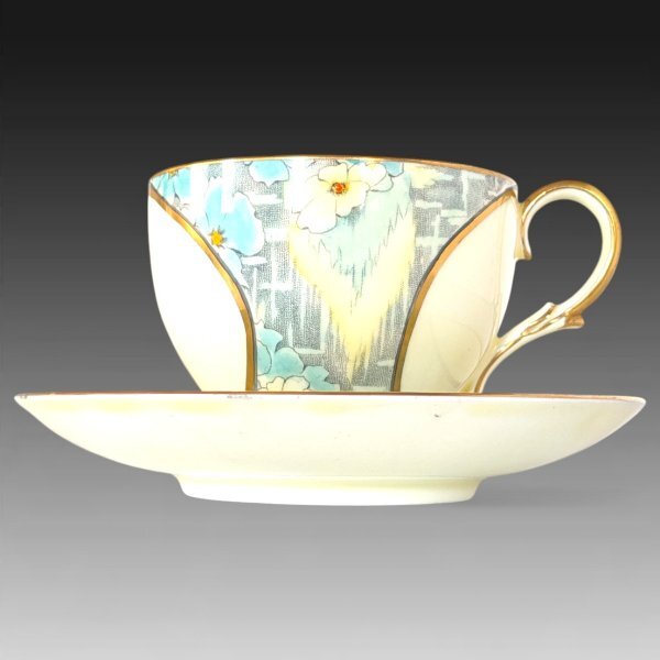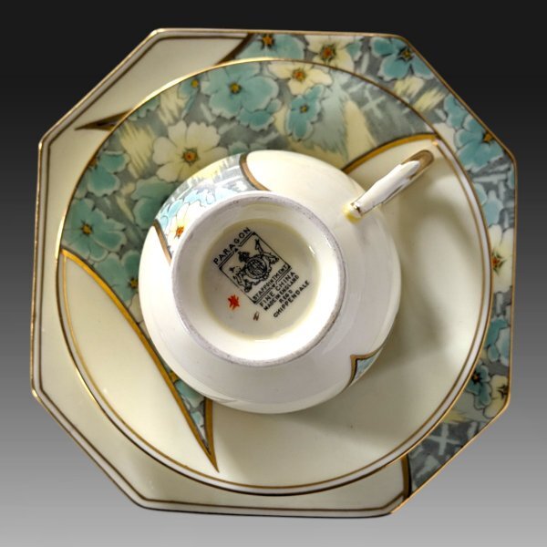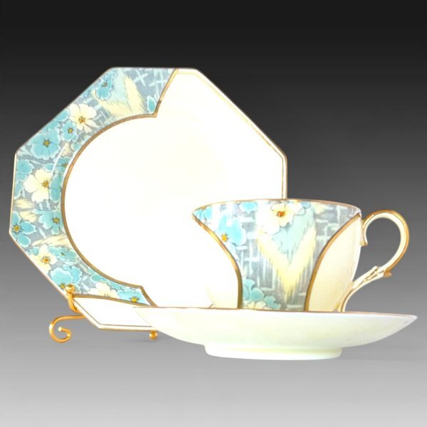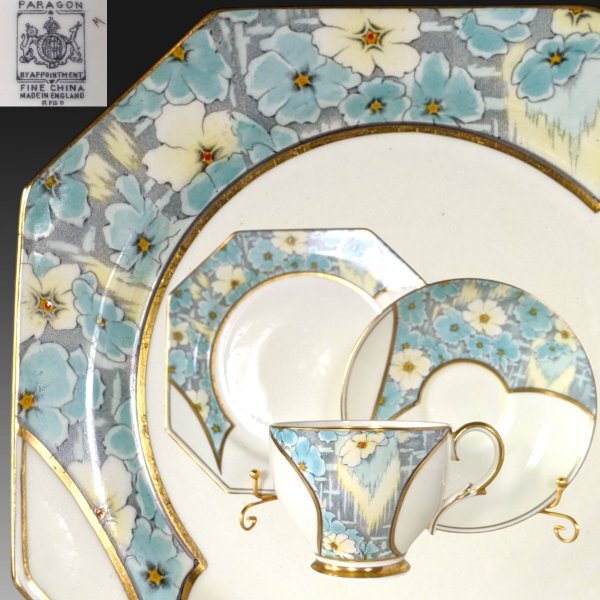 | 【レア】英国王室御用達パラゴン製 / Paragon アールデコ 水色地 花絵 金彩&エナメル盛り装飾 アンティークトリオ 1930年代 811 |
