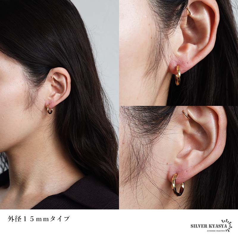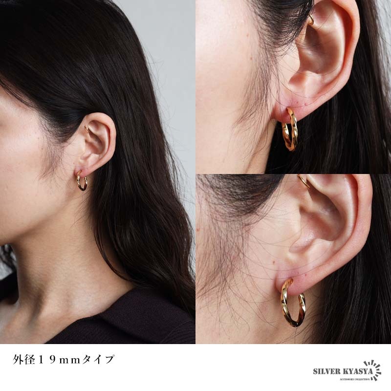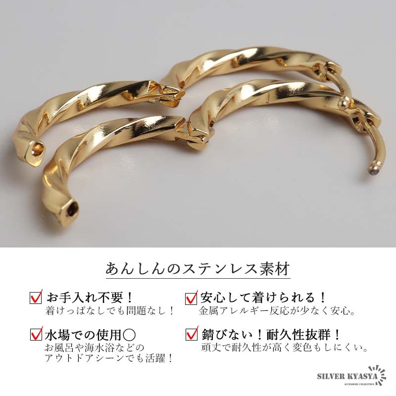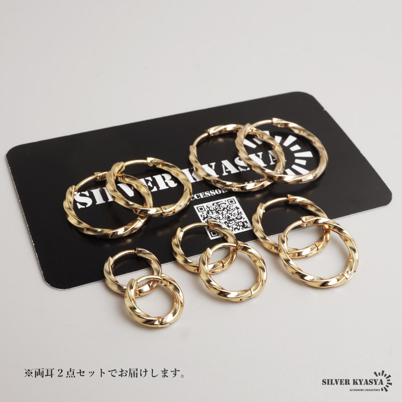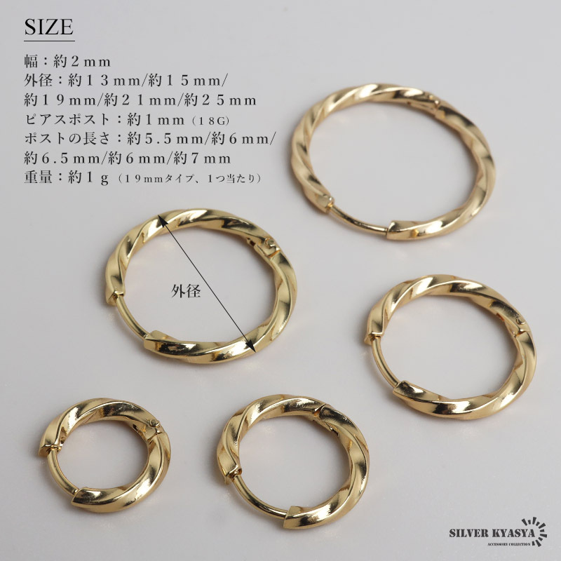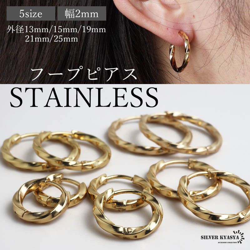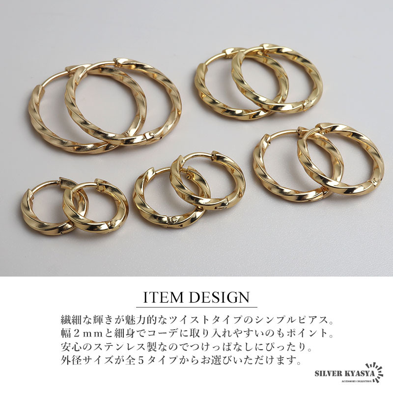 繊細な輝きが魅力的なツイストタイプのシンプルピアス。幅2mmと細身でコーデに取り入れやすいのもポイント。安心のステンレス製なのでつけっぱなしにぴったり。外径サイズが全5タイプからお選びいただけます。