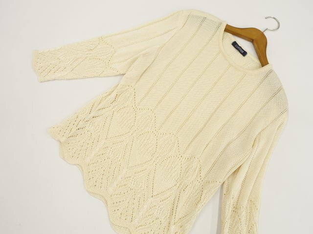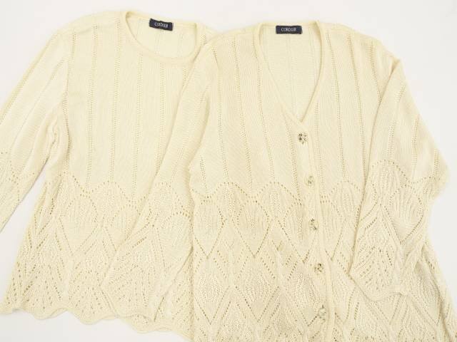 長袖ドロップショルダーカーディガン+長袖ドロップショルダーカットソー ニットアンサンブル2点セット 40 アイボリー 総柄