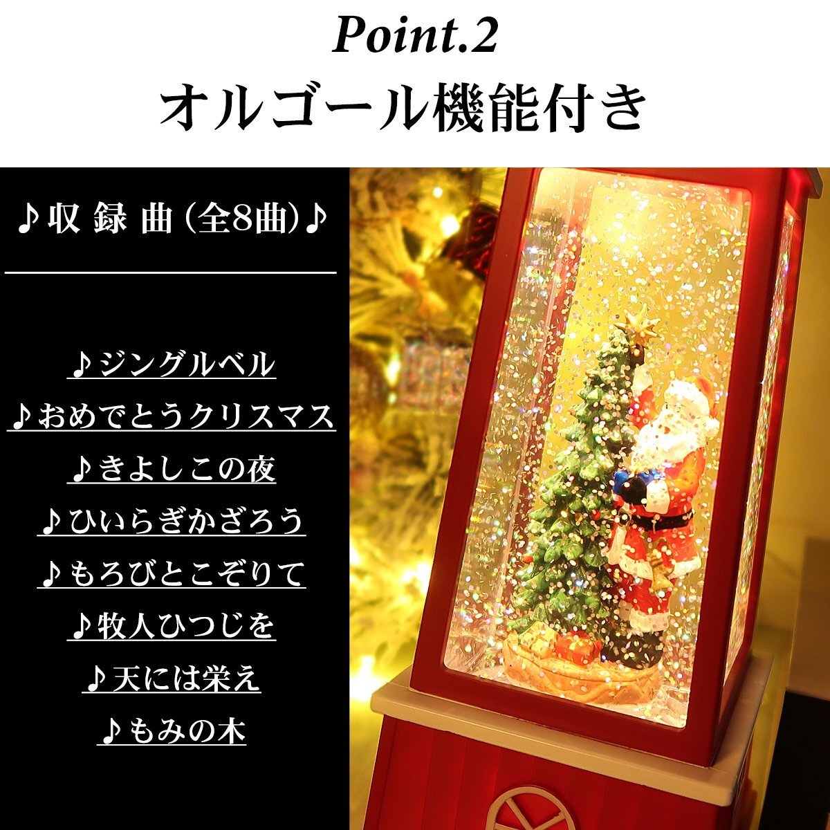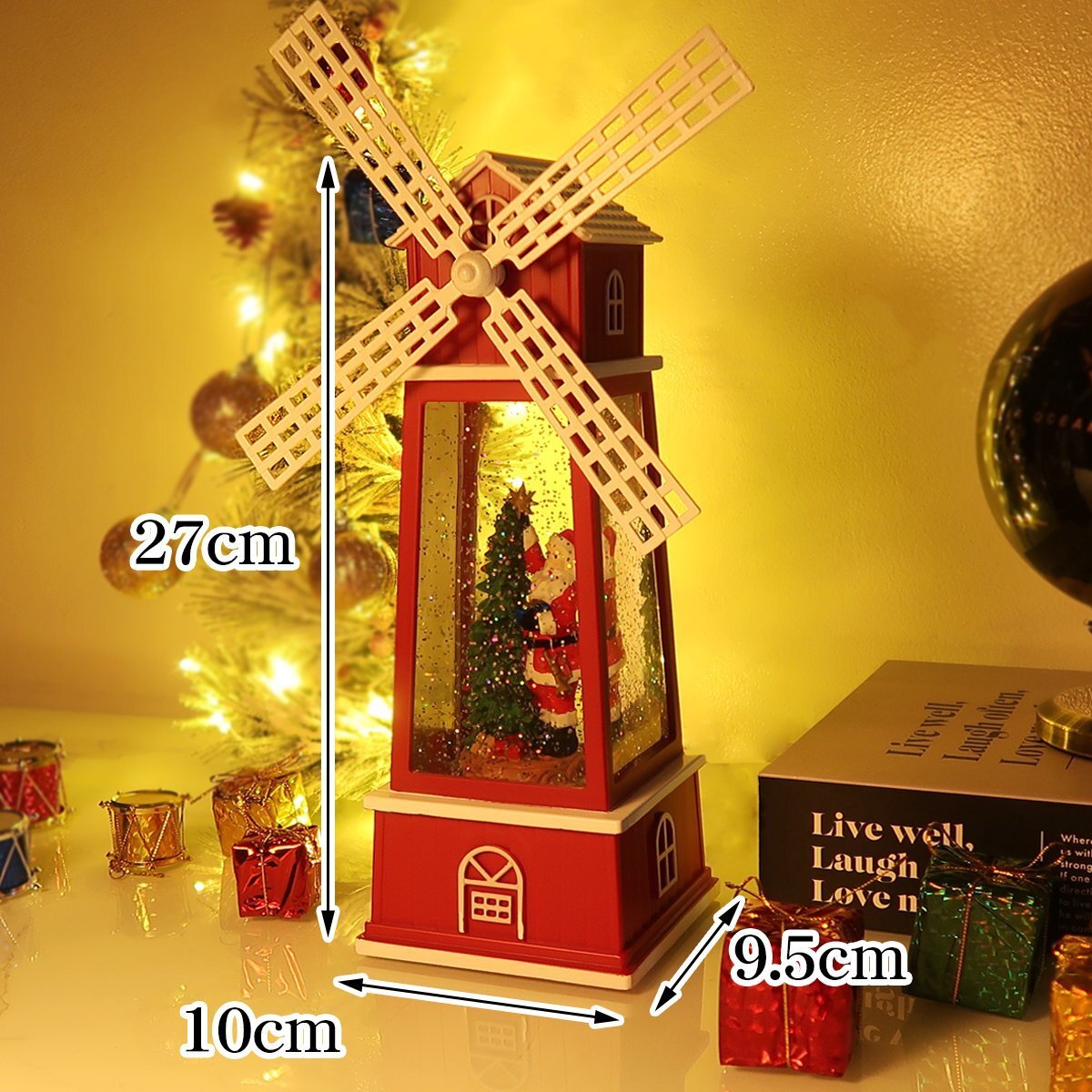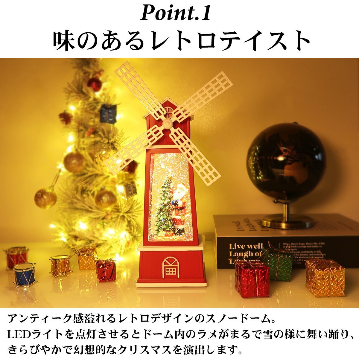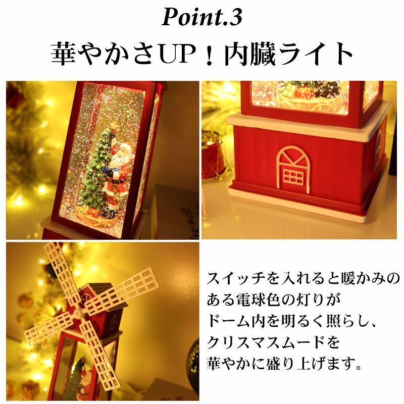 ![]() どこか懐かしさを感じるレトロなスノードーム。 クリスマスを豪華に彩る雰囲気抜群のデザインです! オランダの風車をモチーフにしたメルヘンなデザイン。 LEDライトを点灯させるとドーム内のラメが雪の様に舞い降ります。 風車部分もくるくると回ります♪ クリスマスソング8曲を搭載したオルゴール機能付きでさらに雰囲気抜群♪ LEDライトに照らされ、キラキラと輝きながら音楽を奏でる様が クリスマスムードを盛り上げます♪ 心がなごむ絵本のワンシーンのようなスノードームの世界。 置くだけでもクリスマス気分が高まる事間違いなし! 給電方法は2つ、付属のUSBコードで使用する他、 単三電池3本でコードレスとしての使用も可能! 精巧に作られている為、ライトを点灯させずに 単体でオブジェとして使用しても存在感抜群です! ギフトなどにもおすすめです! ●動作パターン● ・未点灯 ・LED点灯(音楽なし) ・LED点灯(音楽あり) ※乾電池、USB出力用のアダプターは付属しておりません。 点灯時の様子は動画でご覧くださいませ。 動画はこちら ↓↓↓↓↓↓↓↓↓↓↓↓↓ こちらをクリック! 【商品詳細】 サイズ(約): 高さ27cm×幅10cm×奥行き9.5cm コード長さ(約):98cm 【給電方法】 単三電池×3/USBコード |