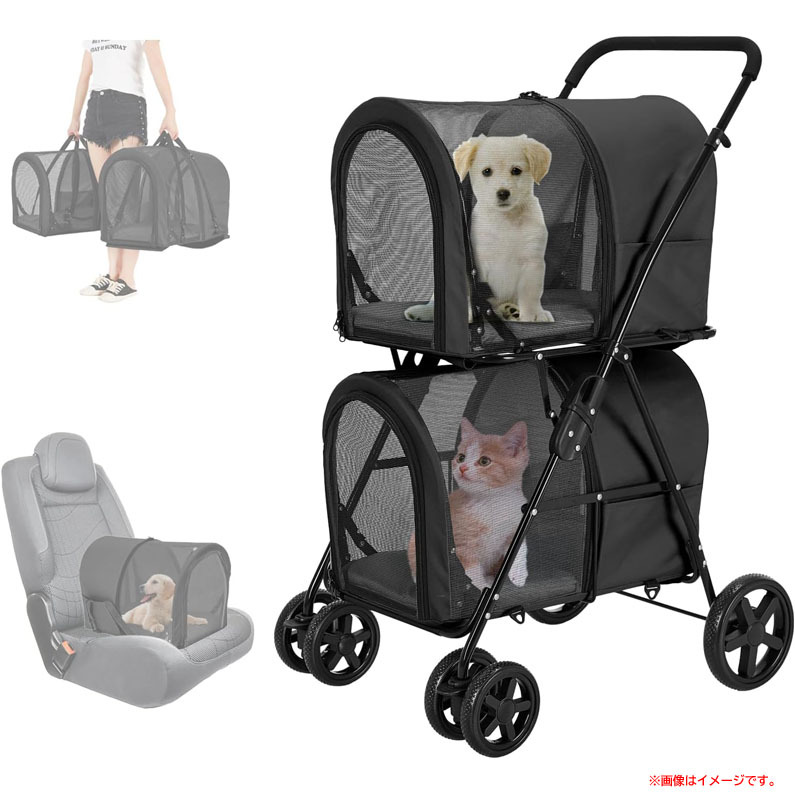 【商品特長】 ◆上下二段式・多頭飼い 上下がそれぞれ独立した空間なので、ペットちゃん別々のパーソナルスペースを確保します。 多頭飼いの飼い主さんもシニア犬の飼い主さんも安心して、お散歩や通院も便利です。 ◆分離型・3WAY多機能 分離型のペットカートで、上下のキャリーは取り外し可能。ペットカート・ペットキャリー・車載用ペットシートの 3WAY使用可能!電車移動はもちろん、ドライブボックスや簡易ハウス代わりとしても使えて、 ペットとのお出かけがますます楽しくなりますね。 ◆折り畳み式・収納便利 折り畳みペットカートで、簡単に折りたたむことができます。 場所を取らず収納することができ、お出掛けるの際も快適に持ち運びます。 ◆安定感&安全性 前輪(φ14cm)はダブルタイヤを採用、360°回転できますので、小回り性が実現、方向転換が簡単です! 後輪(φ19cm)にブレーキが付いて、信号を待つ時や買い物する時などちょっと止まる必要がある場合、 足で下に踏めば、簡単にペットカートを停止させます。 | |||||||||||