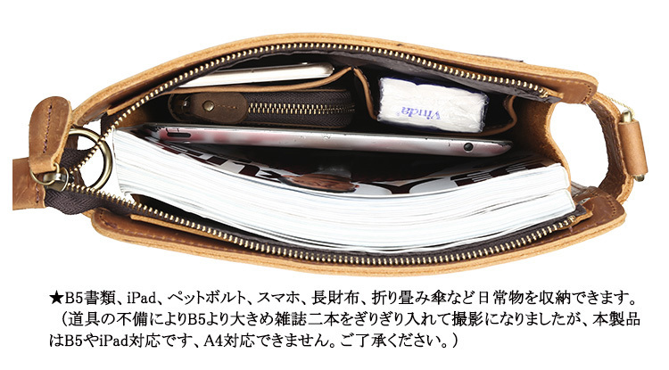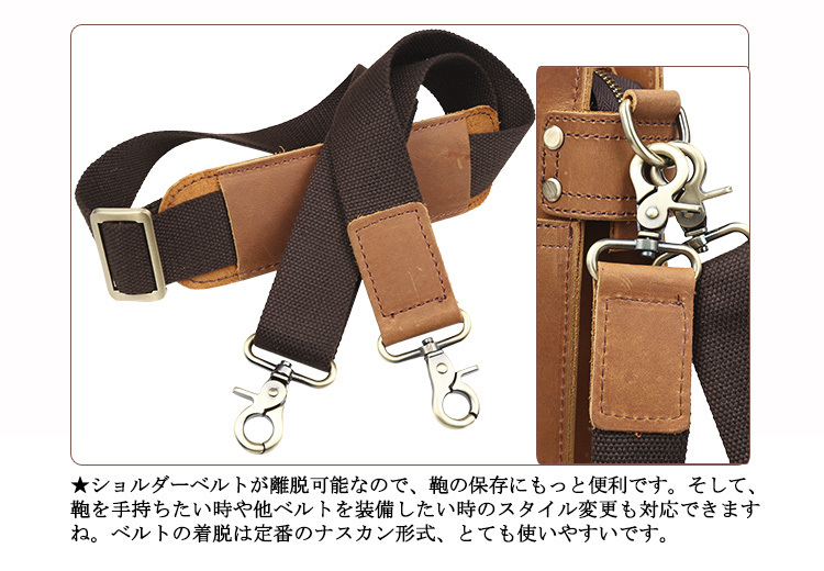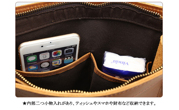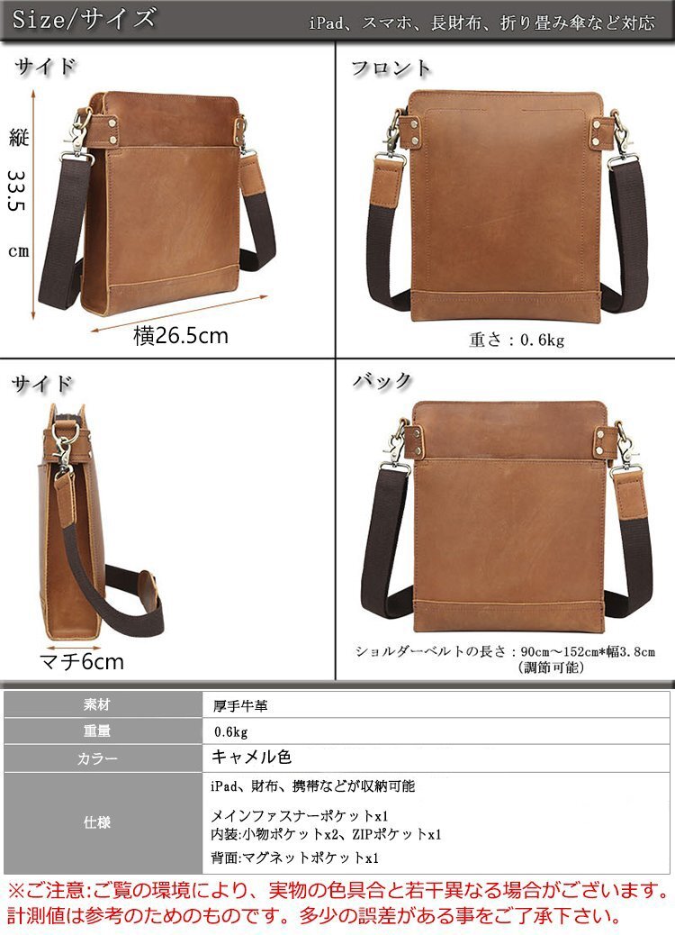 コメント: 洗練されたデザイン、厳選された上質な牛革を使用し革本来の風合いが出ており、シンプルながら存在感のある本革ショルダーバッグです。バッグはIPAD、A4書類、折り畳み傘、ペットボトル、長財布、スマホなどが楽々収納できます。両側には4つの金属鋲とベルトを補強して、金属輪まで用いて繋がります、背負う能力強化!ショルダーストラップは装着可能です。ストラップには肩当てが付き、便利にお使います。背中のポケットはマグネットボタン付きます。内装ポケットも豊富装備しており、小物整理はお手の物。本体のマチも広い、想像づきにくいぐらいで物収納。これが手に馴染むほどな革の表情を引き、ビンテージな印象を与える存在感!