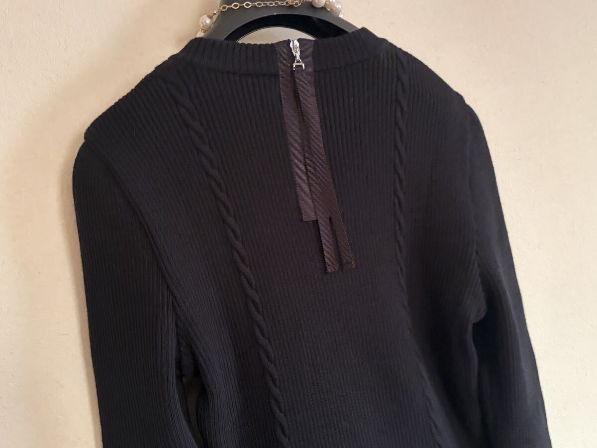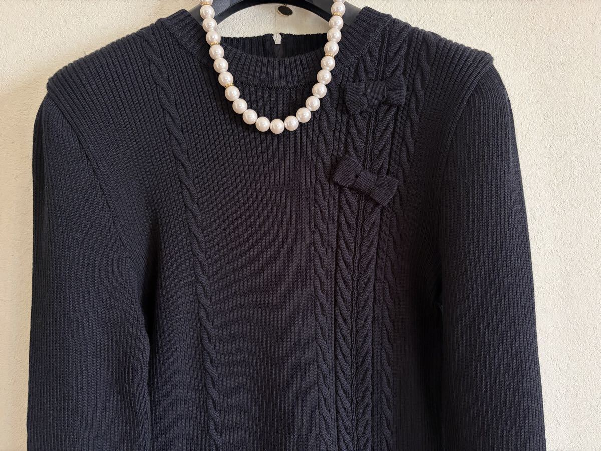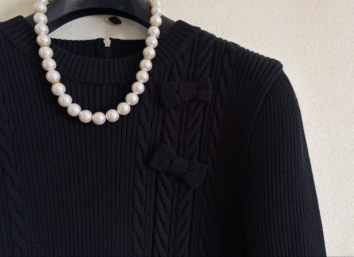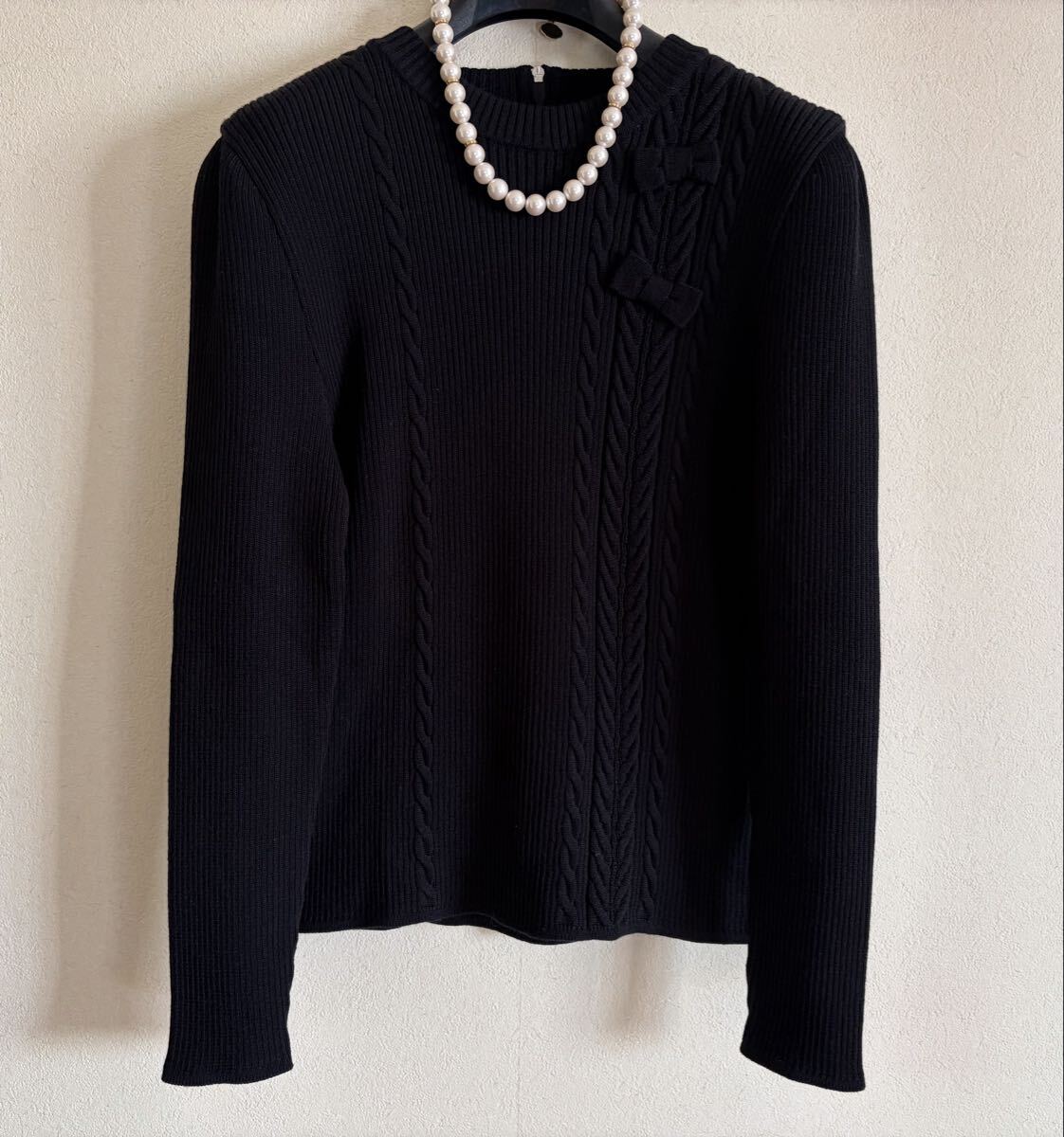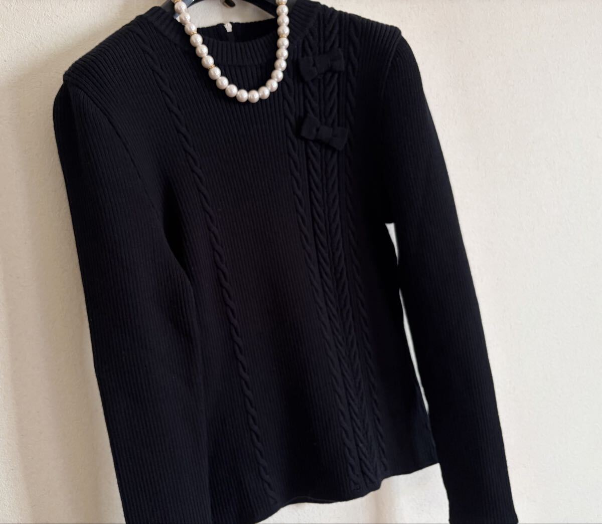 左右縦にデザインされたアラン編みに、立体的なおリボンが2つとっても可愛いアクセントになった可愛いらしいニットトップス♪