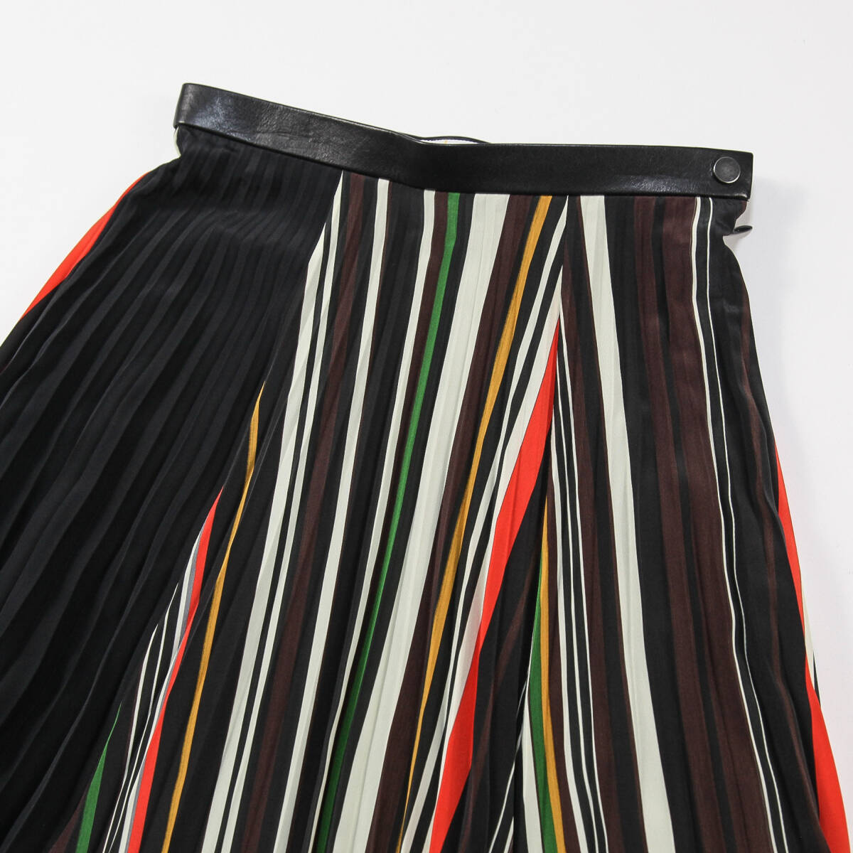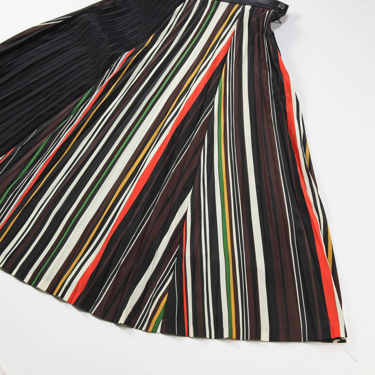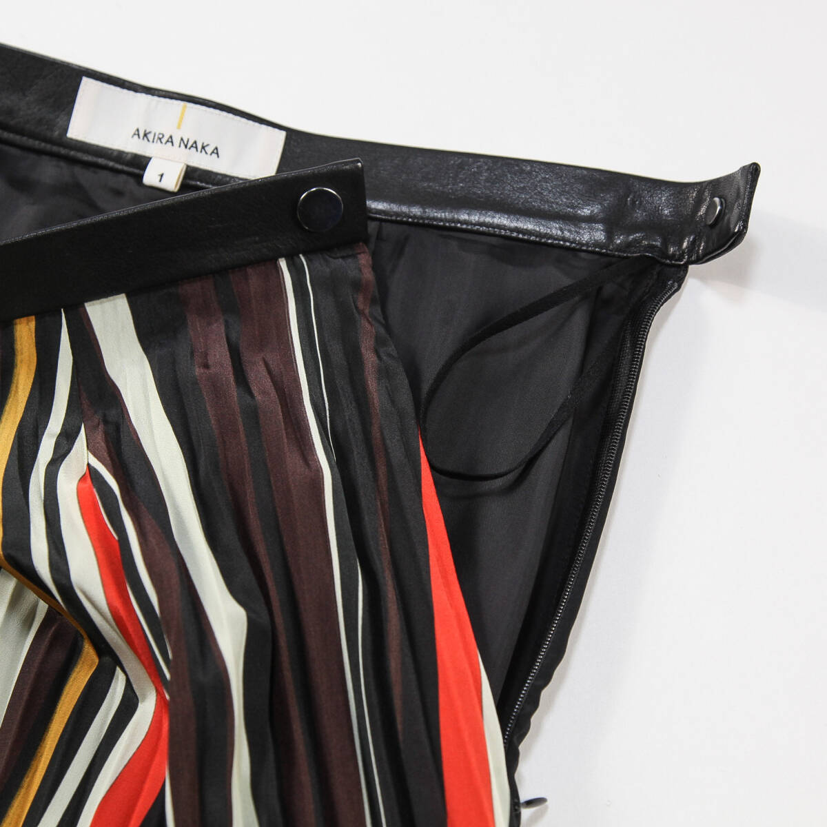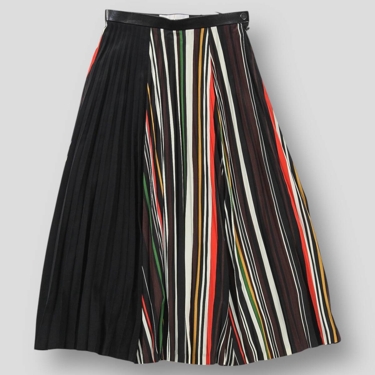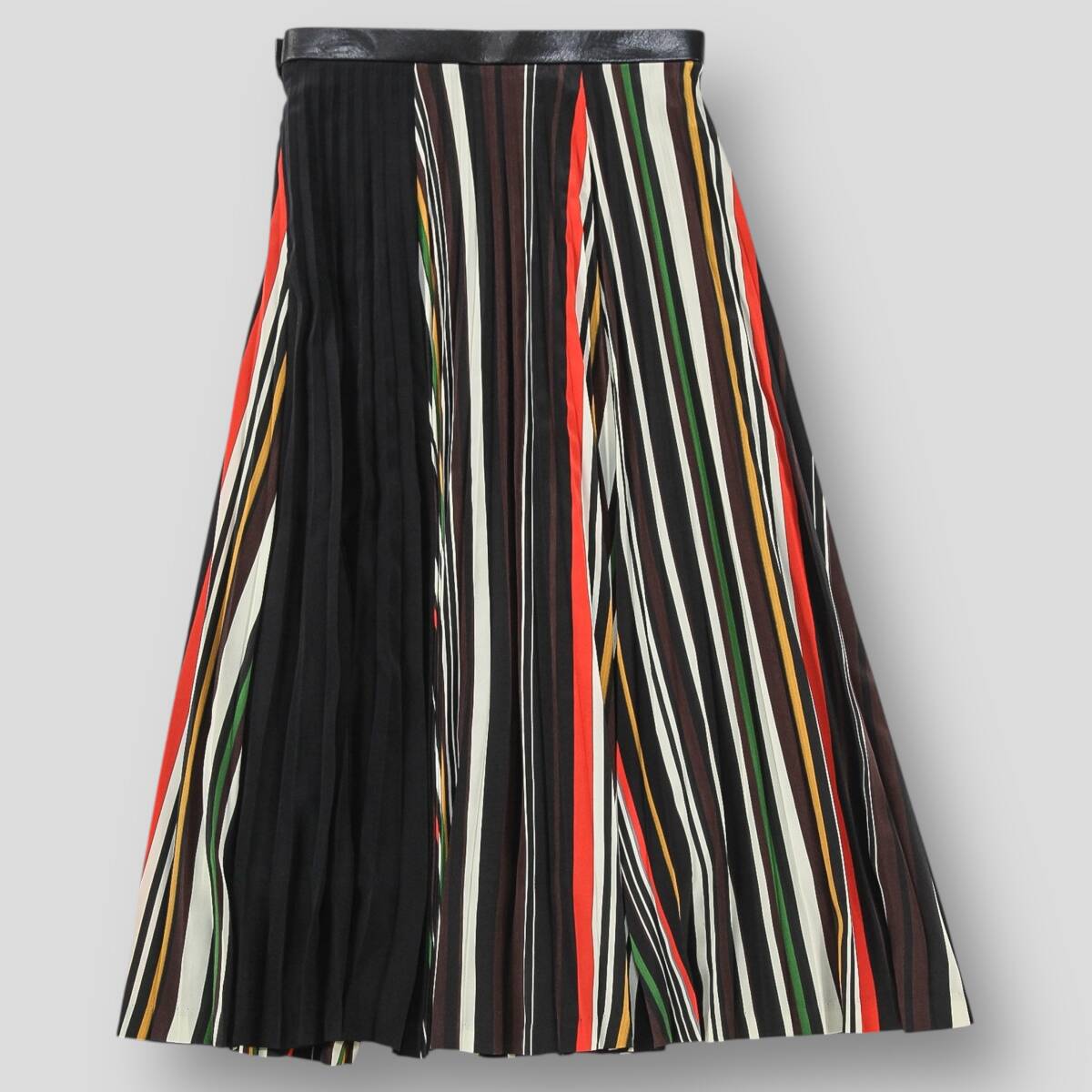 美品 AKIRA NAKA アキラナカ 18AW ミックスボーダー プリーツスカート AP1820BR 1 ブラック ミモレ丈 ウエストレザー ポリエステル SSM6369