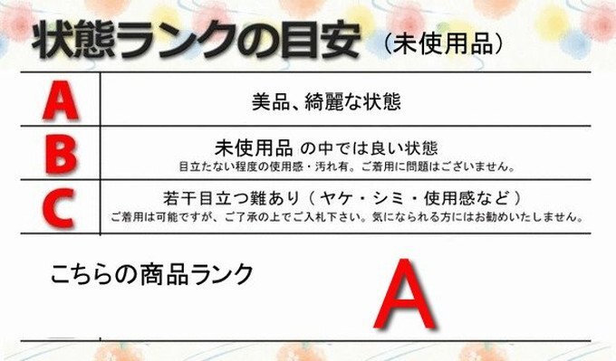 | 当店の中古商品の商品ランクはA~Dの4段階になります。 以下の表をご覧の上ご判断いただきますようお願いいたします。 ※十分な検品の上商品のランクをつけさせていただいておりますが、 見落としによるシミや汚れがある場合がございます。 ご落札の際は、その点をご確認の上ご入札いただきますようよろしくお願いいたします。 ![]() |