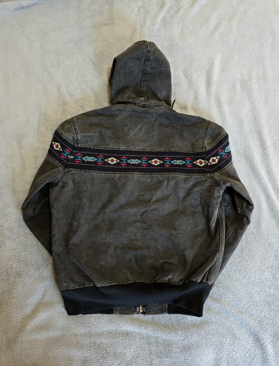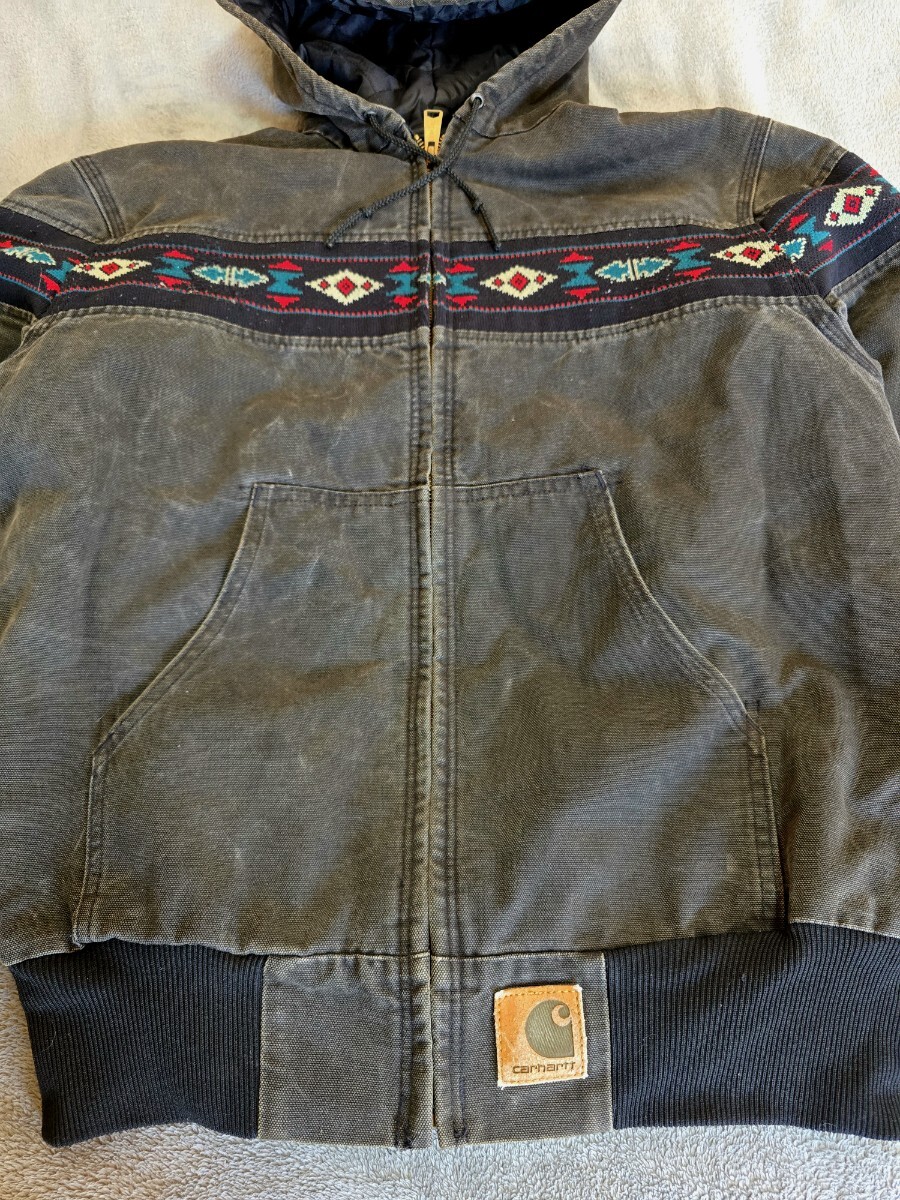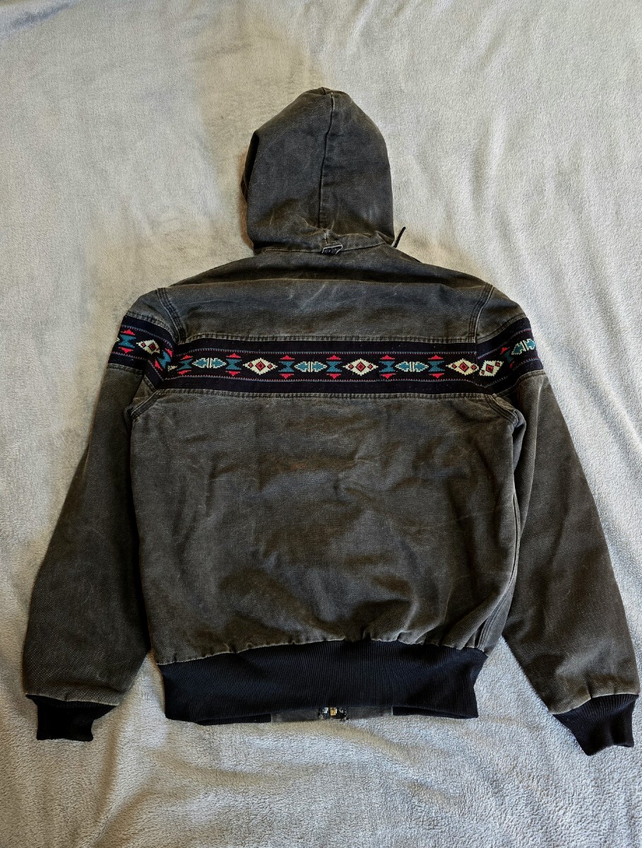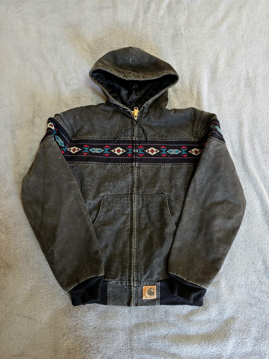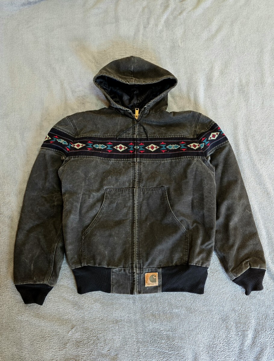 カーハートのネイティブテープのアクティブジャケ ットになります。 フェード感やサイズもちょうどいい1着です。 希少なMサイズのモデルになります。 サイズが小さいほどカーハートは値段が上がります のでぜひいかがでしょうか。 型番:J78 BLK 着丈:67cm 肩幅:49cm 身幅:56cm 袖丈:64cm なお、素人採寸ですので誤差が生じる場合がございます、ご了承ください。