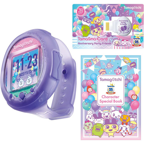 | 商品概要 | Tamagotchi Smart 25th アニバーサリーパーティーセット Tamagotchi Smart25周年限定の豪華スペシャルセット、「Tamagotchi Smart アニバーサリーパーティーセット」が登場! 限定デザインのTamagotchi Smart本体、「たまスマカード アニバーサリーパーティーフレンズ」、歴代のたまごっちが掲載された「Tamagotchi 25th Character Special book」のセットです。 本体カラーはクールなパープル! 付属のたまスマカードのメモリを本体に挿入すると、限定の育成キャラクターや、Tamagotchi Smartをスタイルチェンジできる様々なアイテム・ミニゲームをダウンロードすることができます。 たまスマカードからダウンロードできる一部のキャラクターは6月16日(木)から開催する『たまごっちファン投票』により決定します。 ここでしか手に入らない「Tamagotchi 25th Character Special book」はボリュームがたっぷりな歴代の人気たまごっちの図鑑となっています。 ※画像はイメージです。 (本商品に付属のセット内容以外、すべて別売りです。) | |||