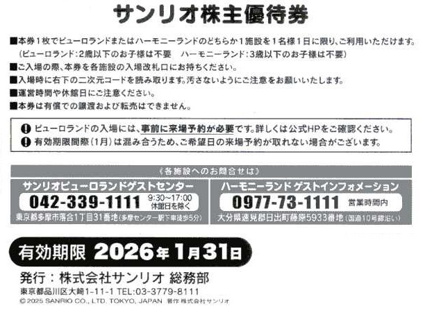 即決!サンリオ 株主優待券 サンリオピューロランド・ハーモニーランド ミニレター可 パスポート フリーパス