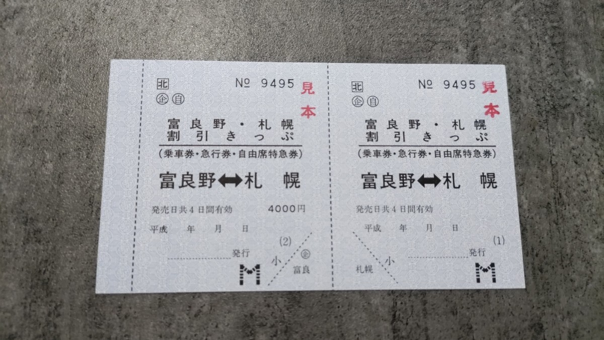 富良野・札幌割引きっぷ(乗車券・急行券・自由席特急券)(コレクション用)です。