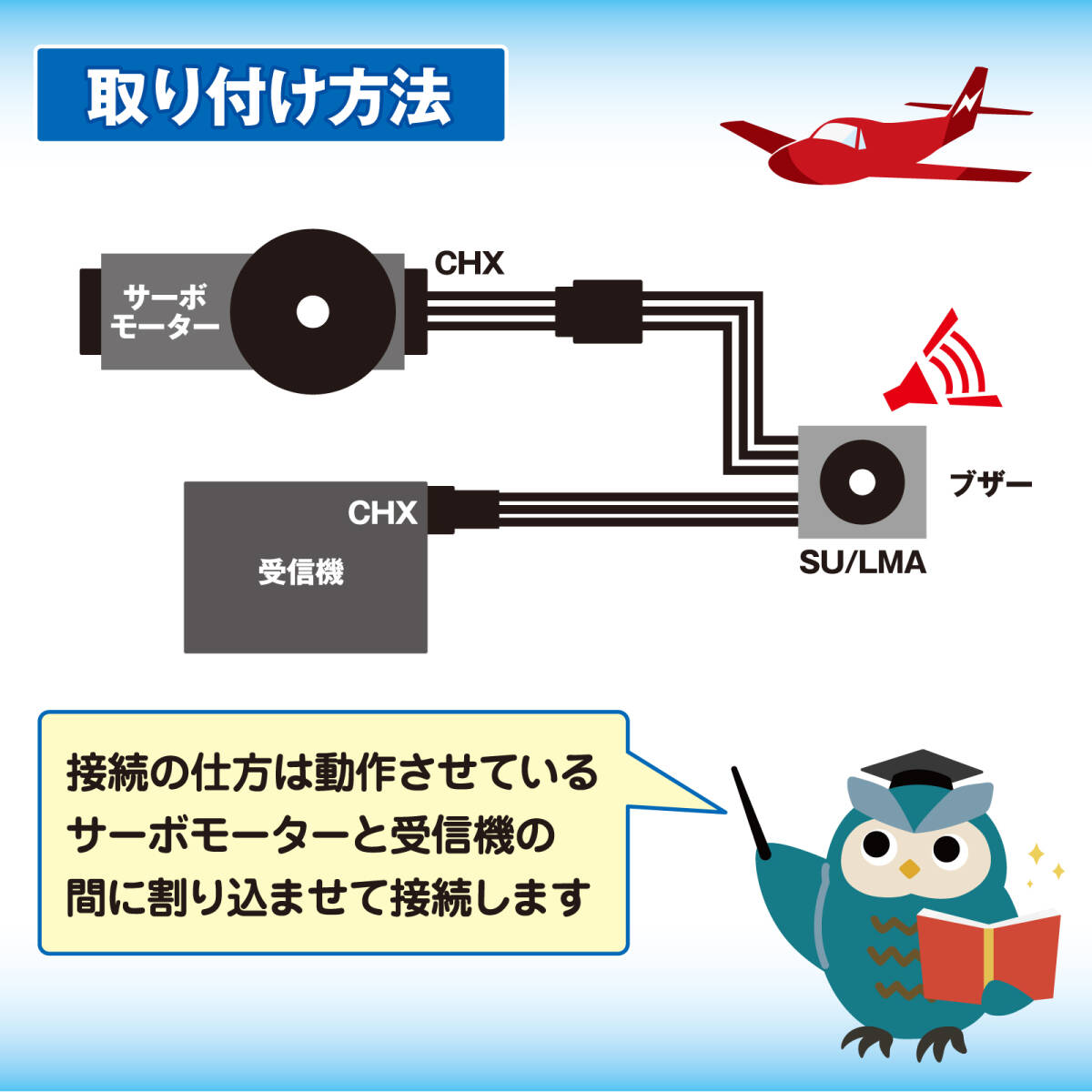 取り付け方法は簡単で、サーボモーターと受信機の間に割り込ませて接続します。