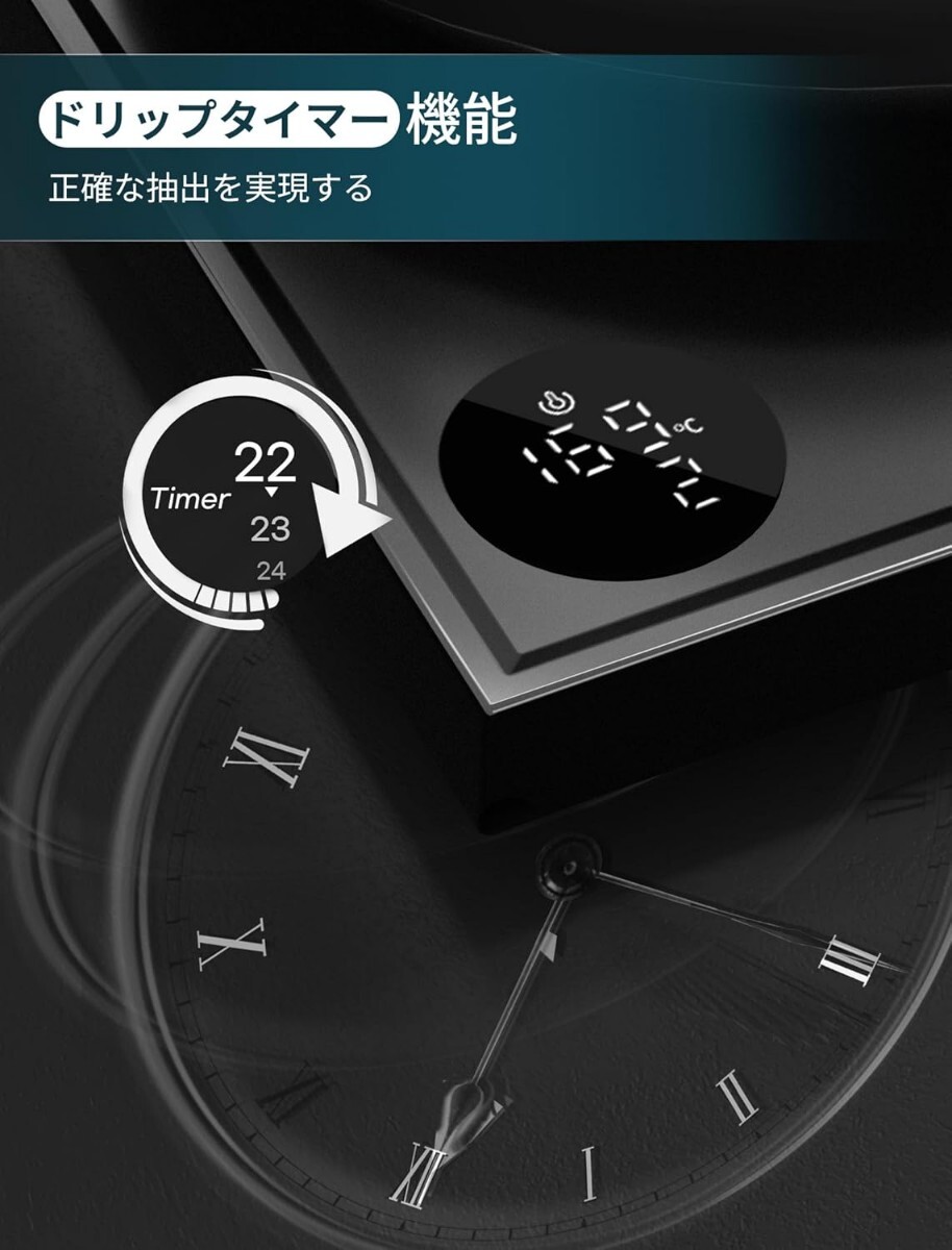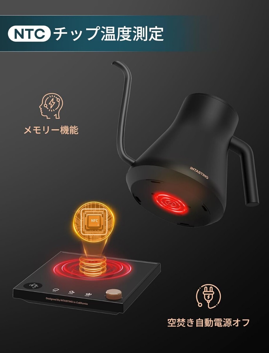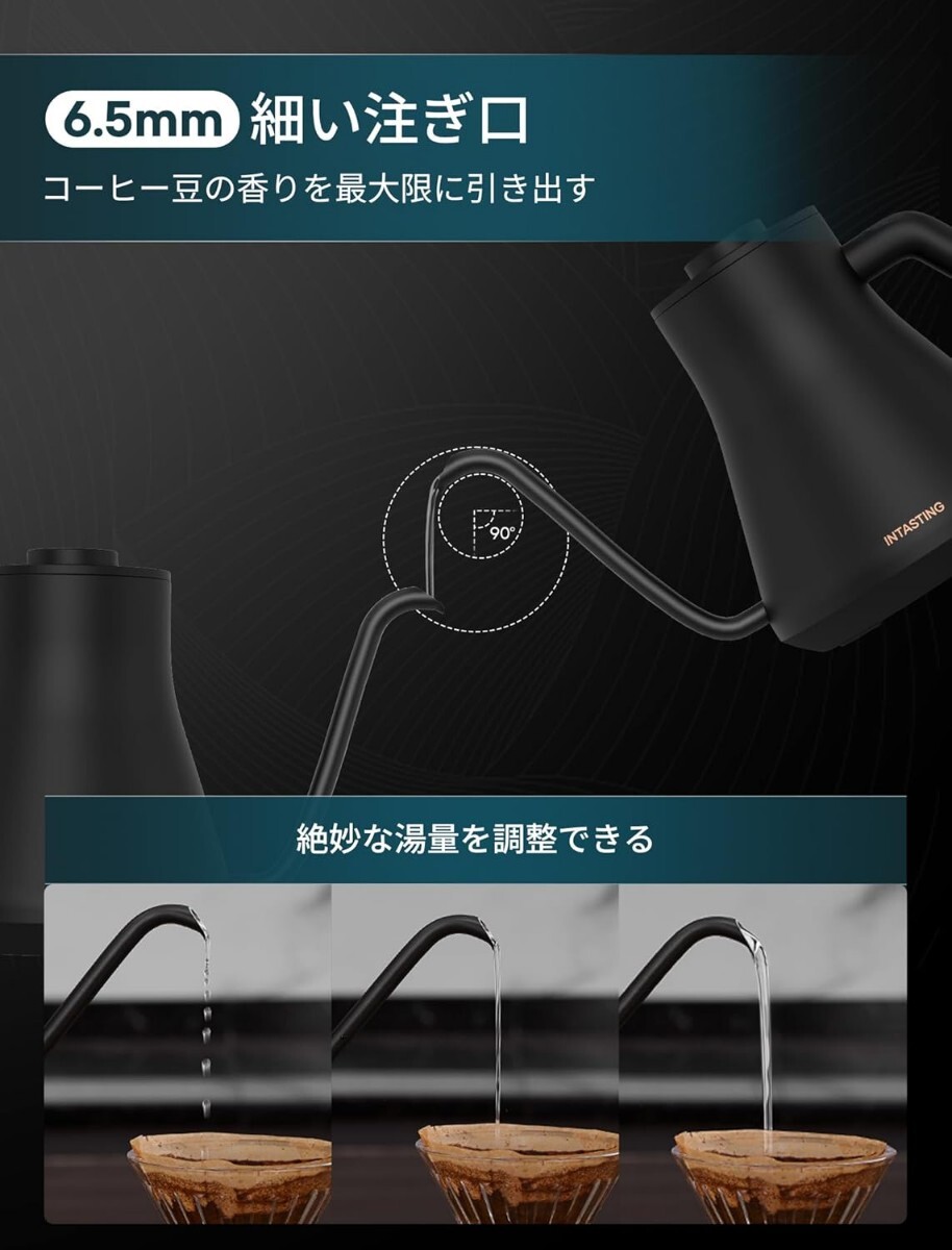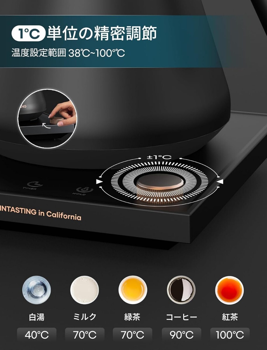 intastingのコーヒーケトルは、細部に宿る美味しさを追求、1℃の調整で究極の一杯を実現します。このケトルは1°C単位の精密調節で、38~100℃(100~212°F)までの範囲で設定できます。細かく挽いたコーヒー豆と、時間や温度を精密に調整したお湯を組み合わせて抽出することで、最高品質のコーヒーを提供します。