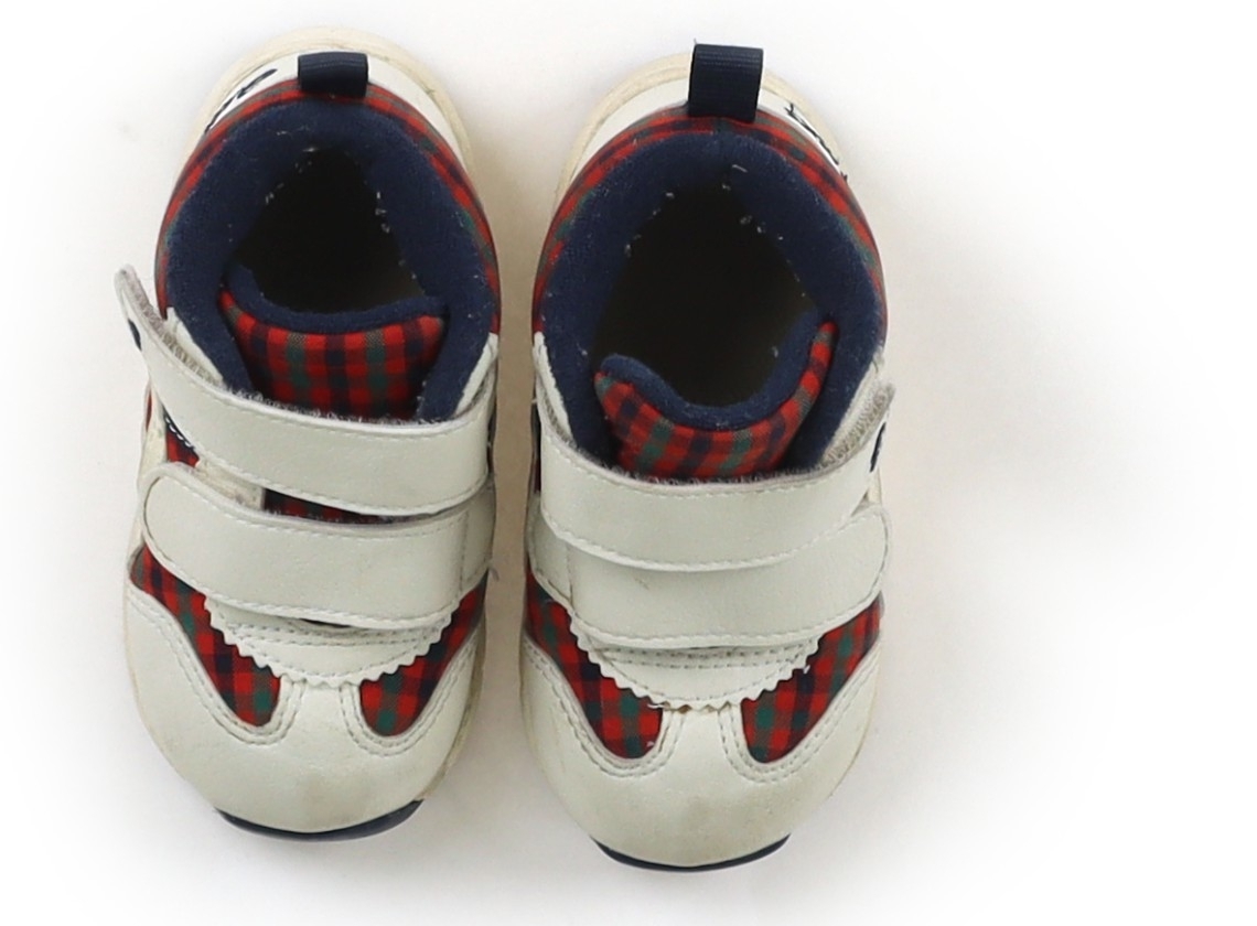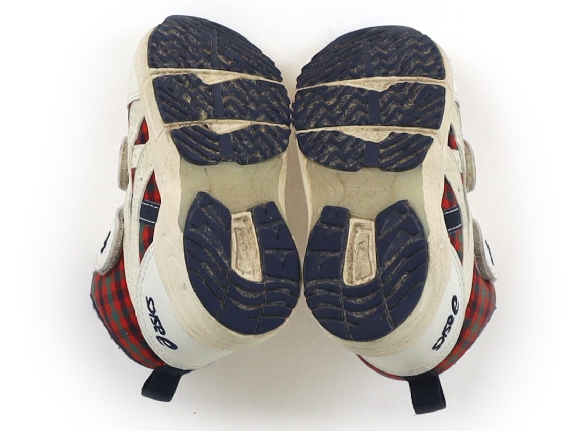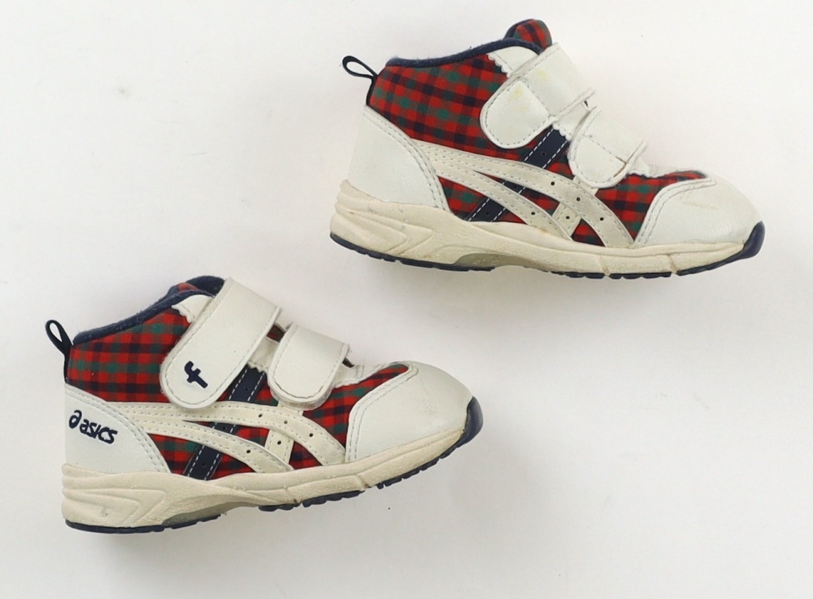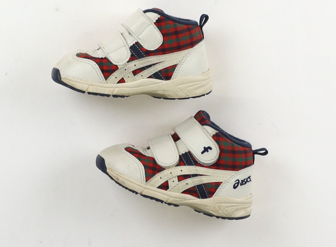 実際のサイズ表記は13.5cm。マジックテープでの着脱。靴底に土汚れの跡があります。履き口には毛玉がありますが、まだお使いいただけます。Asicsコラボ。