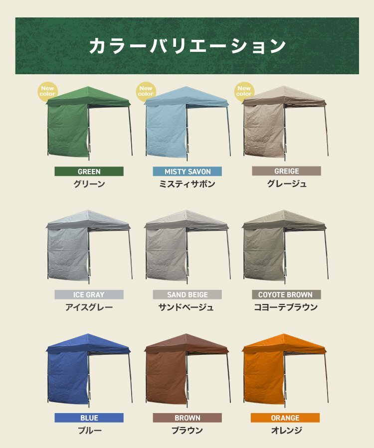 横からの日差しもカット。当店のタープテントにピッタリなサイドシートです。 サイドシートの裏側もしっかりとシルバーコーティングされており、真夏のジリジリとした厚さでも紫外線をしっかりガードしてくれます。 全9ヶ所に取り付けられたマジックテープで着脱も簡単。 最大4面の取り付けが可能なので目隠しが必要な場合でも使用することが出来ます! 【商品仕様】 カラー:ブラウン 商品サイズ(約):縦200×横300cm 材質:ポリエステル ※完全防水ではありませんのでご注意ください。 ※若干隙間が生じる場合もございます。 ※タープテント本体は付属しておりません。 |